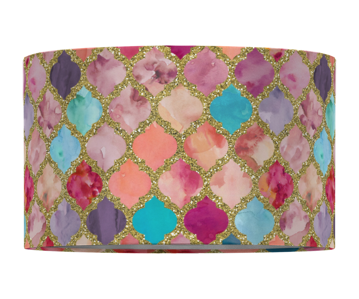 This design is simply the glitter moroccan pattern. The glitter outlining the pattern is a sparkling looking gold. The inside of the moroccan pattern is a watercolor texture with pinks, purples, teals, peaches, and blues. The coordinating design has a fun name and initial in the beautiful gold color.
