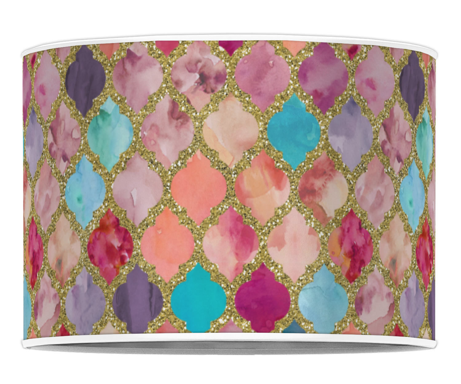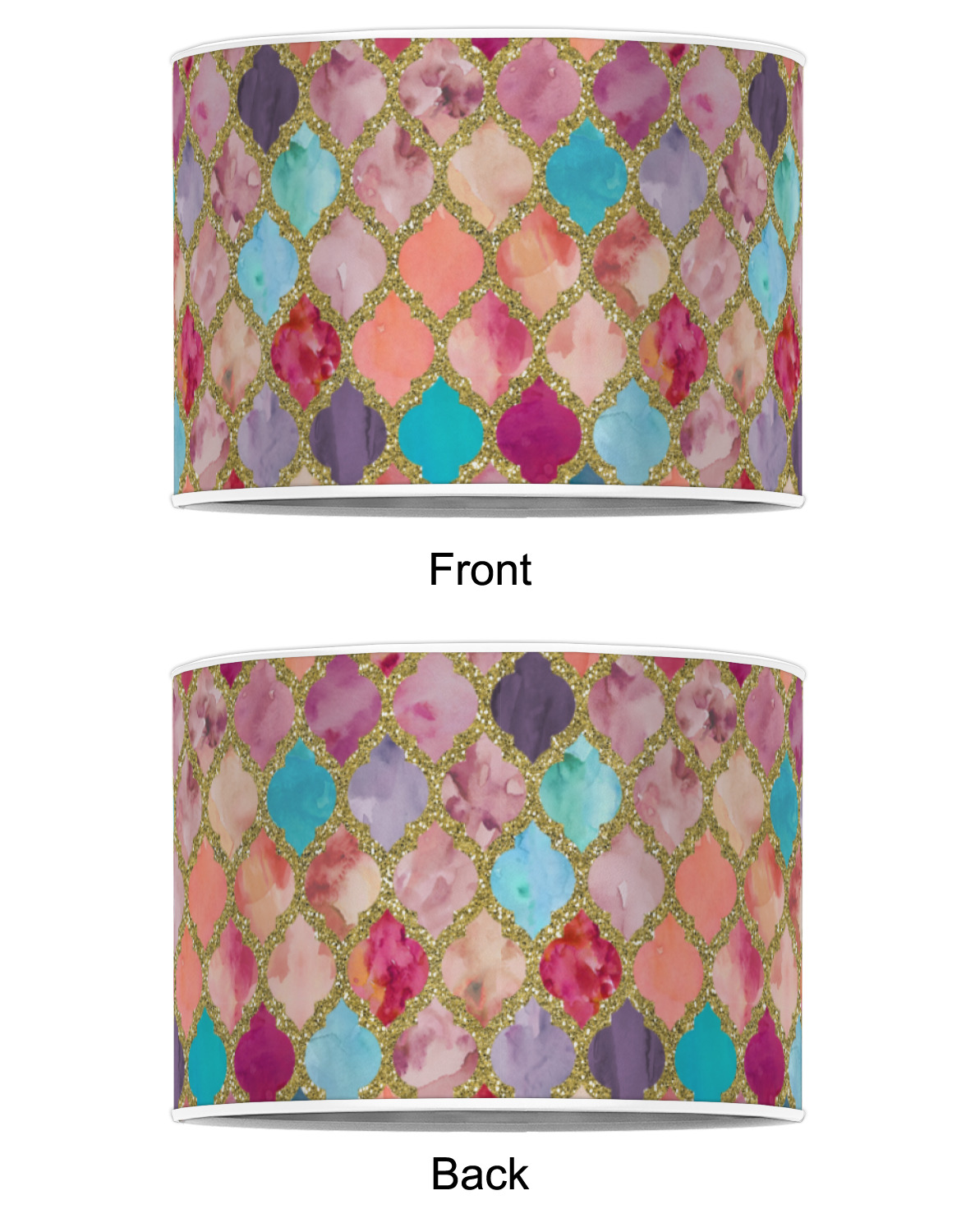 This design is simply the glitter moroccan pattern. The glitter outlining the pattern is a sparkling looking gold. The inside of the moroccan pattern is a watercolor texture with pinks, purples, teals, peaches, and blues. The coordinating design has a fun name and initial in the beautiful gold color.