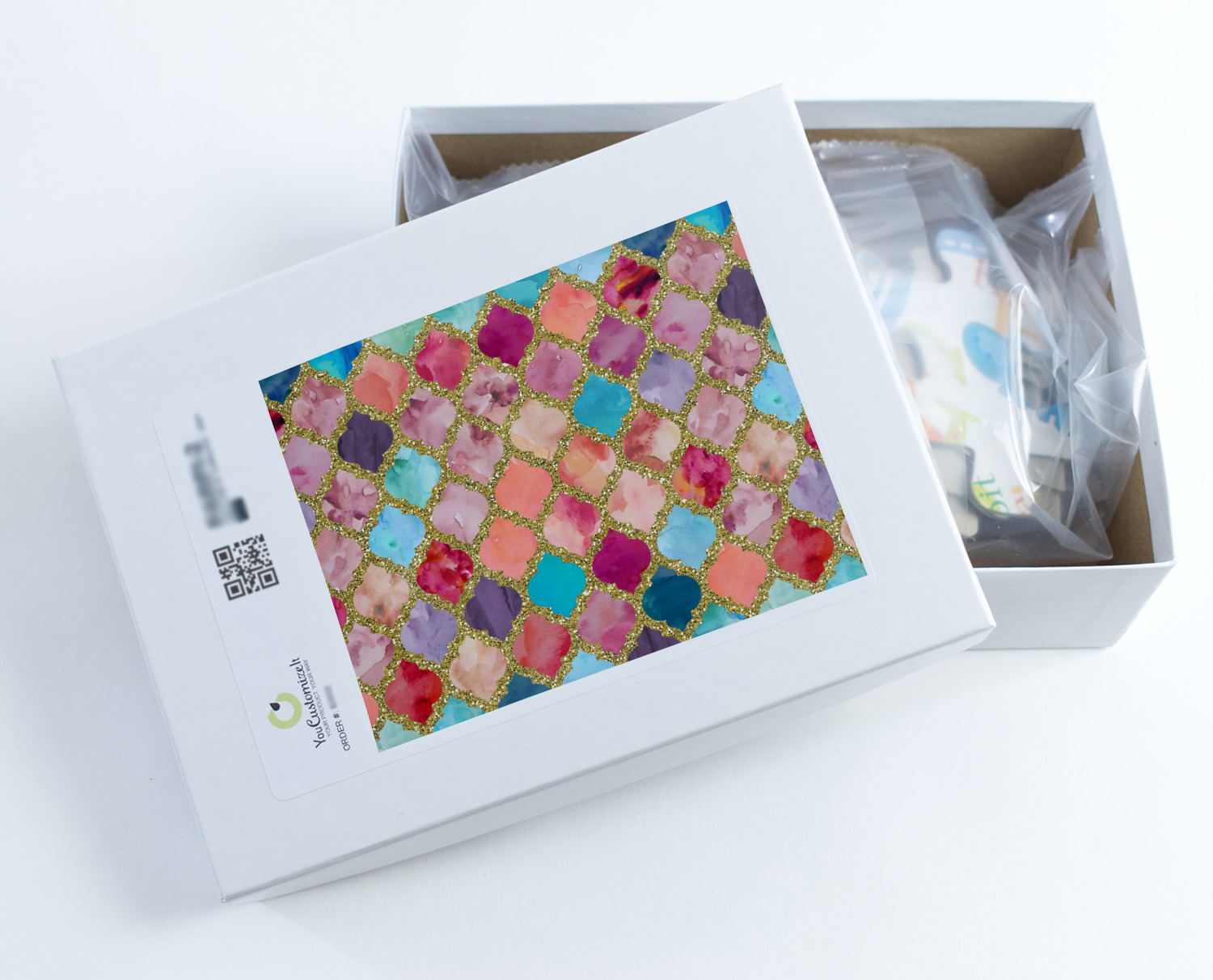 You can also upload your logo or art that you or your kids drew. To create more challenging jigsaw puzzles, you can create a pattern from with your logo or artwork. You can also add other elements such as text or personalization.