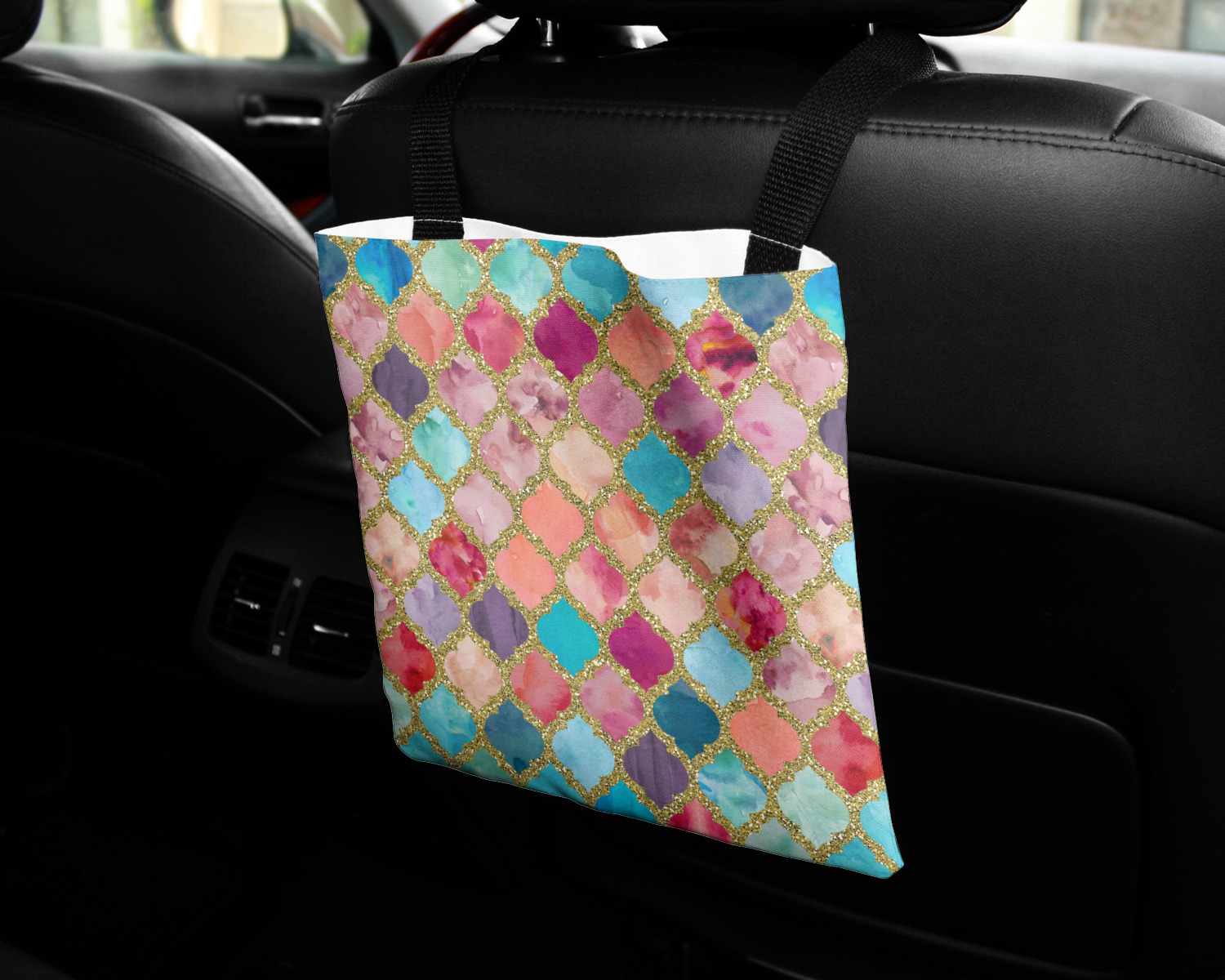 These car back seat organizers are sturdy tote-like bags, fabricated from a robust polyester, and features a single handle on the back side. The strap features an attachable velcro for easy attachment to headrests, grocery carts, car seats, and more. Simply undo the velcro, loop the strap around the headrest, reattach the velcro, and let the organizer hang from the front seat. These car organizers are the perfect means of increasing your backseat's legroom, while storing multiple items in one place for better accessibility. Each car back seat organizer measures at 10 by 10 inches, and features your personalized design printed across its front and back.