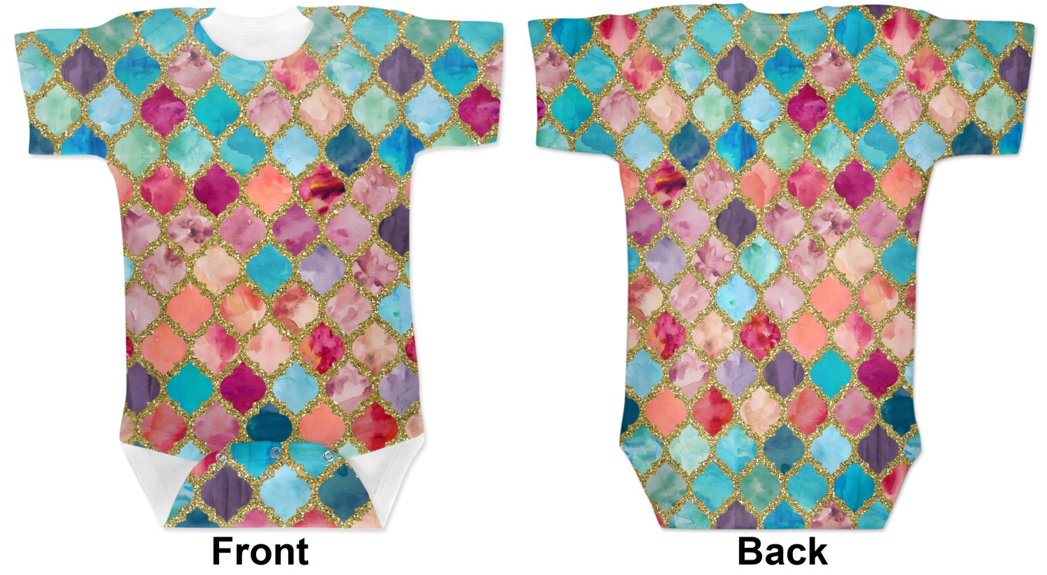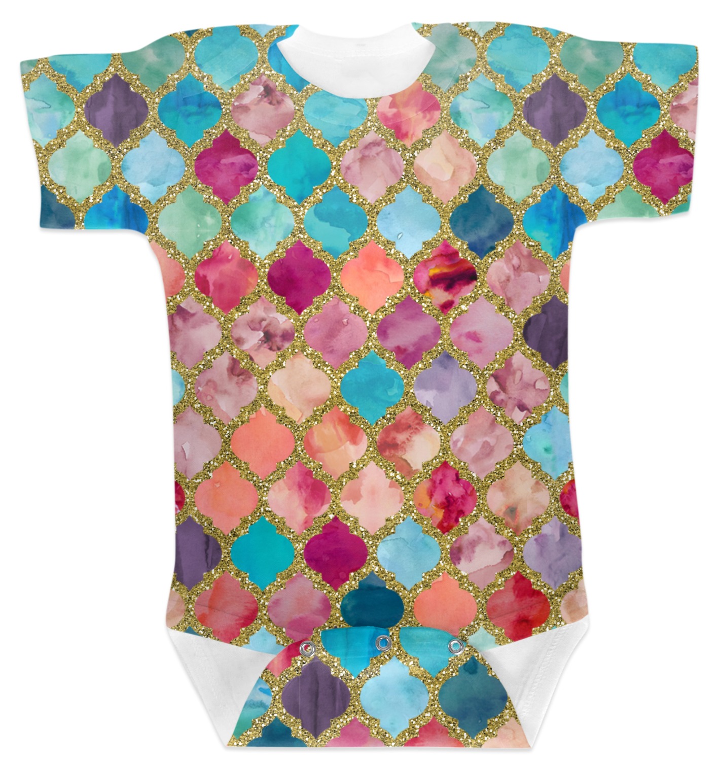 This design is simply the glitter moroccan pattern. The glitter outlining the pattern is a sparkling looking gold. The inside of the moroccan pattern is a watercolor texture with pinks, purples, teals, peaches, and blues. The coordinating design has a fun name and initial in the beautiful gold color.