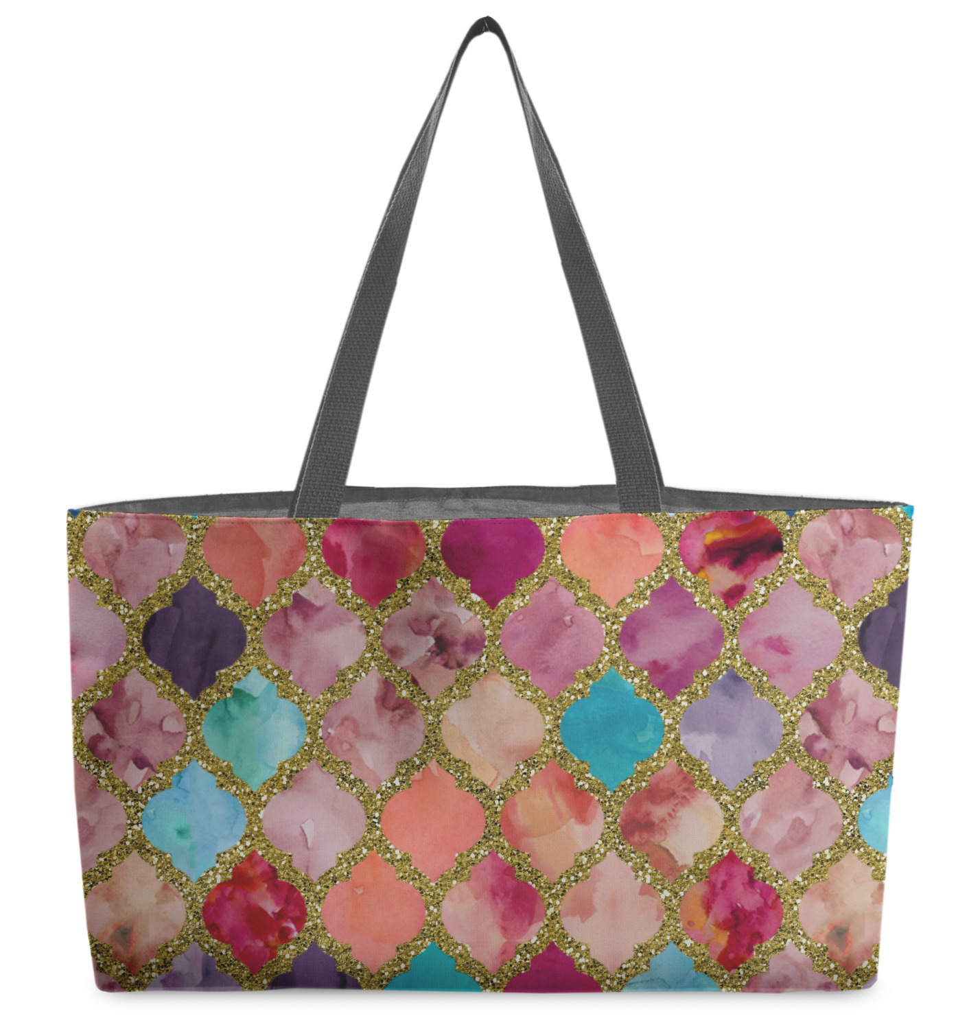 This design is simply the glitter moroccan pattern. The glitter outlining the pattern is a sparkling looking gold. The inside of the moroccan pattern is a watercolor texture with pinks, purples, teals, peaches, and blues. The coordinating design has a fun name and initial in the beautiful gold color.