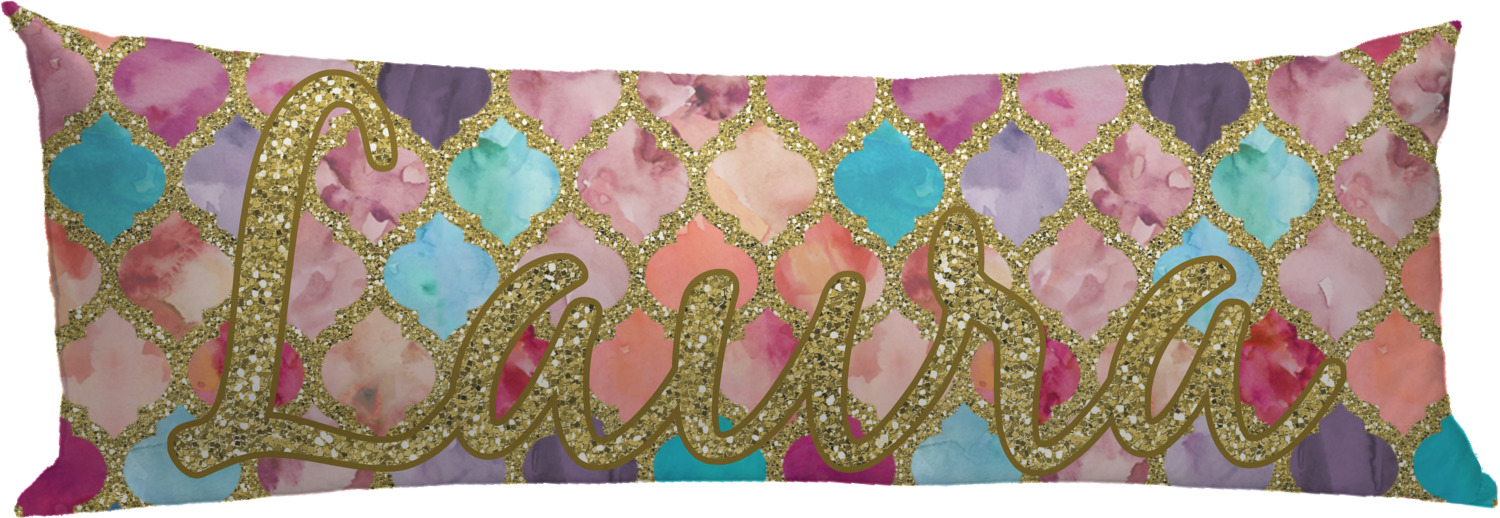 This design is simply the glitter moroccan pattern. The glitter outlining the pattern is a sparkling looking gold. The inside of the moroccan pattern is a watercolor texture with pinks, purples, teals, peaches, and blues. The coordinating design has a fun name and initial in the beautiful gold color.