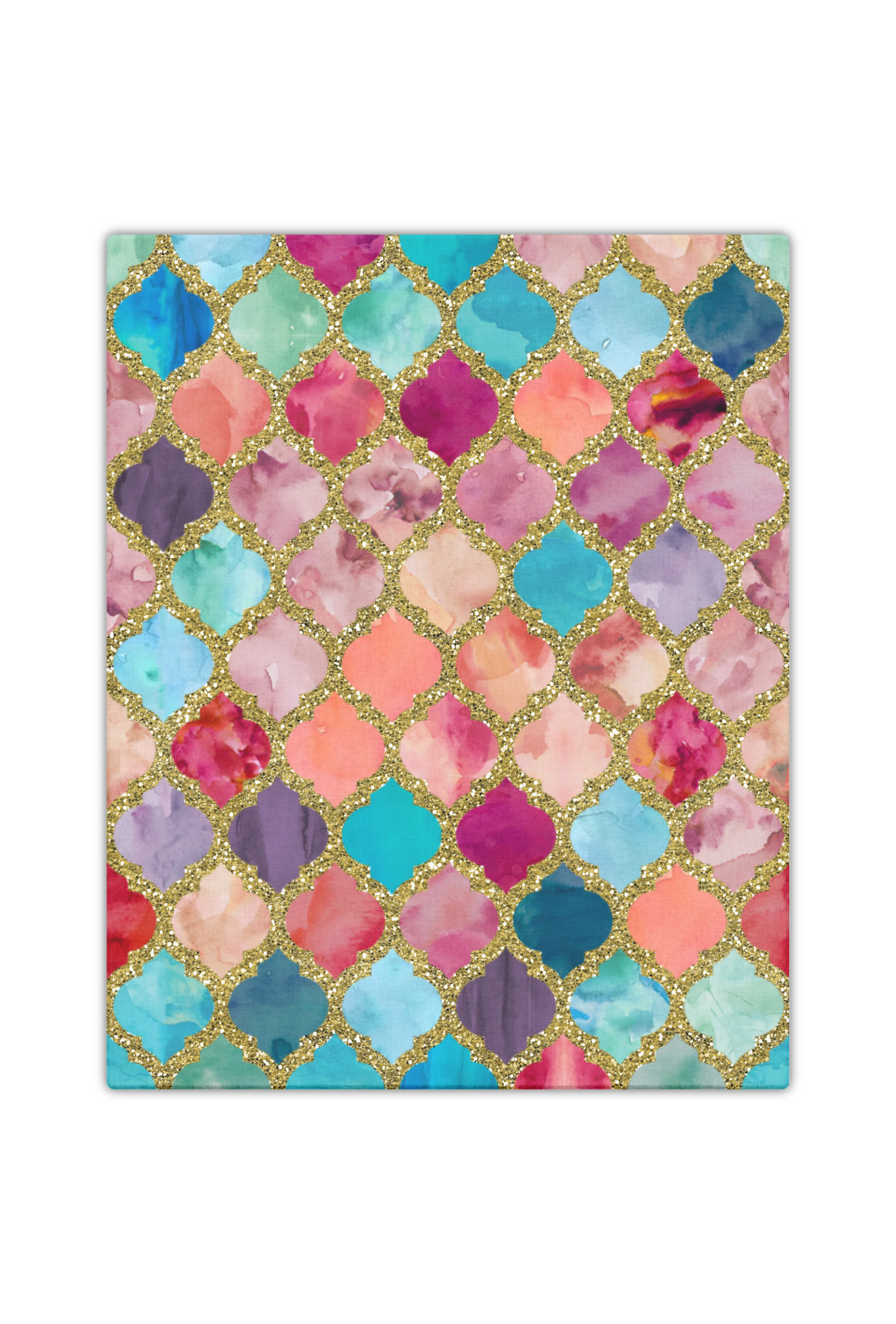 This design is simply the glitter moroccan pattern. The glitter outlining the pattern is a sparkling looking gold. The inside of the moroccan pattern is a watercolor texture with pinks, purples, teals, peaches, and blues. The coordinating design has a fun name and initial in the beautiful gold color.
