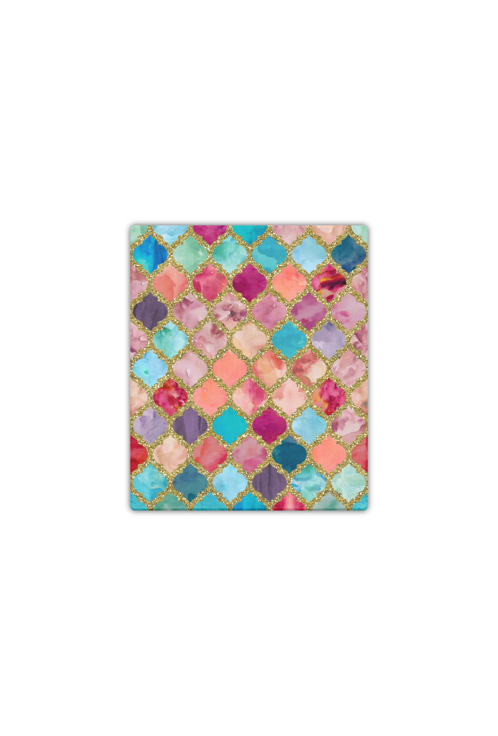 This design is simply the glitter moroccan pattern. The glitter outlining the pattern is a sparkling looking gold. The inside of the moroccan pattern is a watercolor texture with pinks, purples, teals, peaches, and blues. The coordinating design has a fun name and initial in the beautiful gold color.