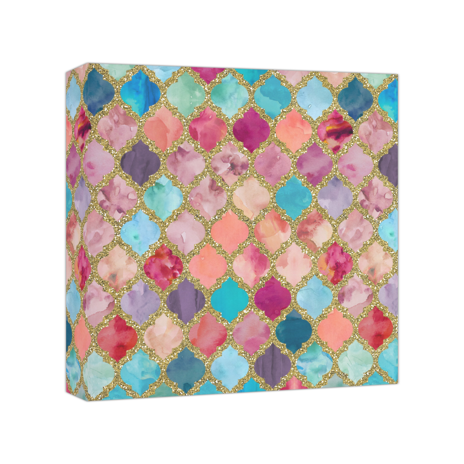 This design is simply the glitter moroccan pattern. The glitter outlining the pattern is a sparkling looking gold. The inside of the moroccan pattern is a watercolor texture with pinks, purples, teals, peaches, and blues. The coordinating design has a fun name and initial in the beautiful gold color.