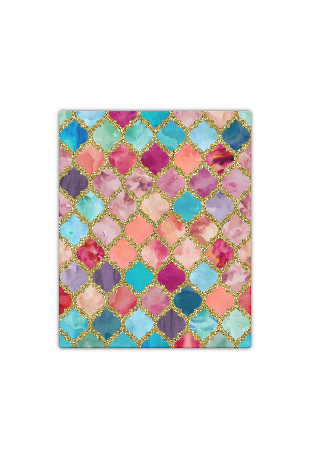 This design is simply the glitter moroccan pattern. The glitter outlining the pattern is a sparkling looking gold. The inside of the moroccan pattern is a watercolor texture with pinks, purples, teals, peaches, and blues. The coordinating design has a fun name and initial in the beautiful gold color.