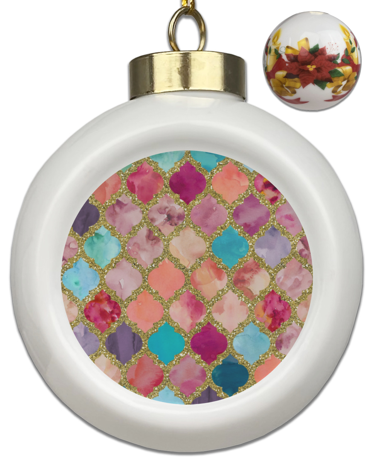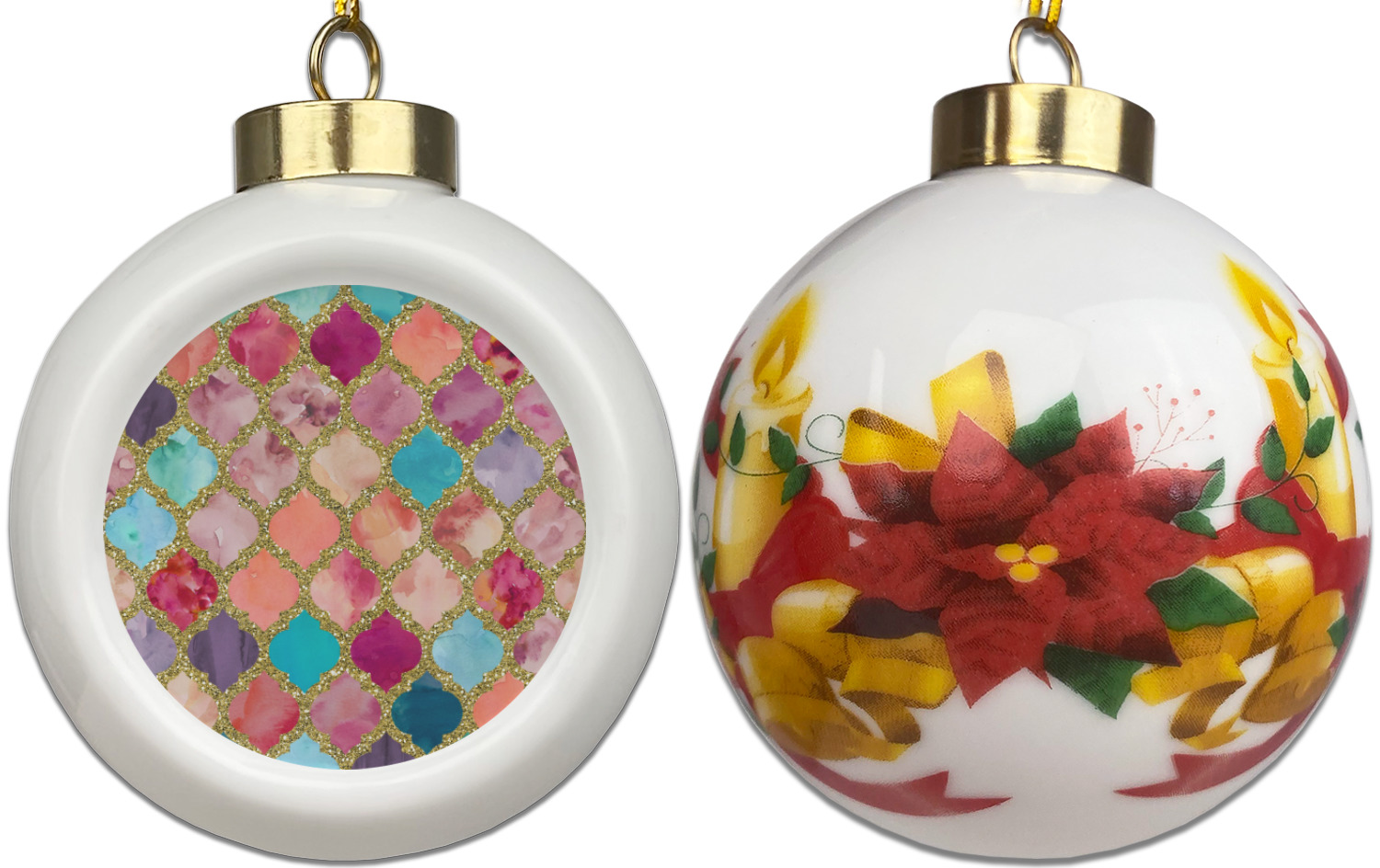 Our Christmas ornaments are a unique ceramic ball shape with a twist as it has a flat face to display your custom design! Select from one of our two design types - Christmas Tree or Poinsettia Garland - to adorn the curved back of your personal design. Each ornament measures 3H x 2.5W x 2D accompanied with a gold string accent for finishing touches to hang on your beautiful Christmas tree!