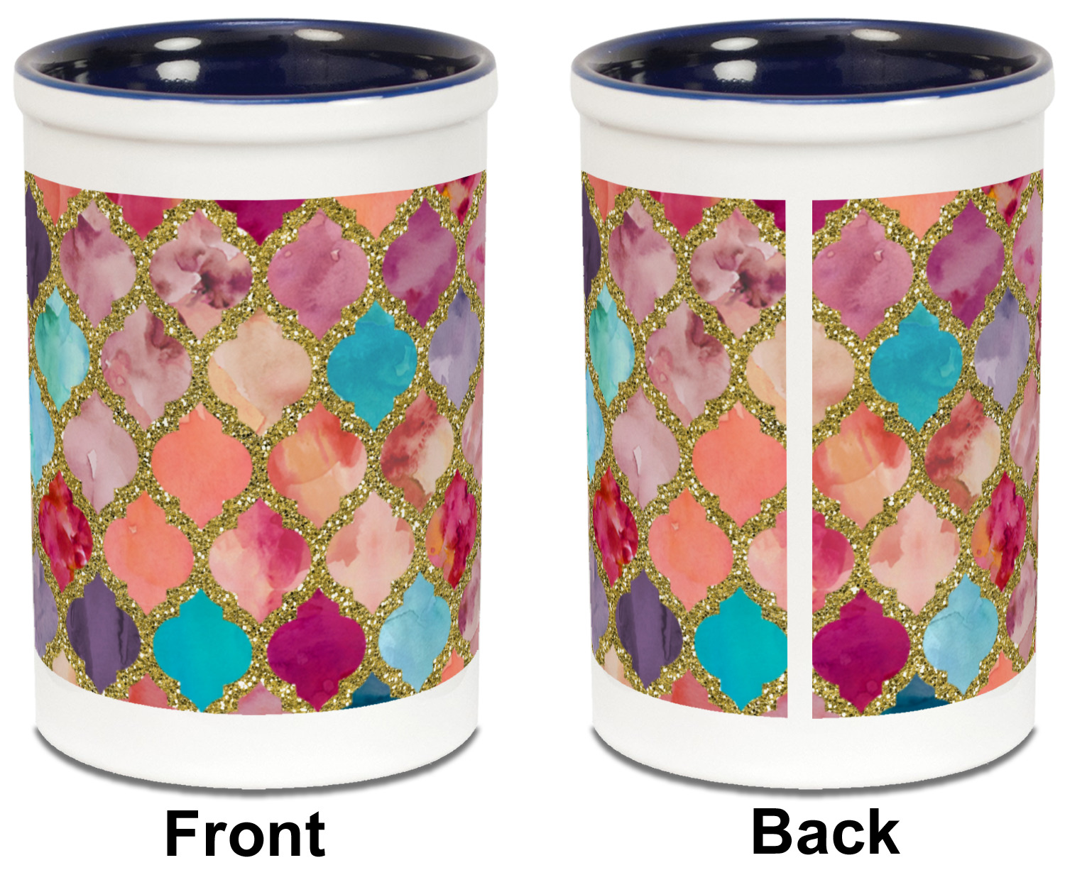 This design is simply the glitter moroccan pattern. The glitter outlining the pattern is a sparkling looking gold. The inside of the moroccan pattern is a watercolor texture with pinks, purples, teals, peaches, and blues. The coordinating design has a fun name and initial in the beautiful gold color.