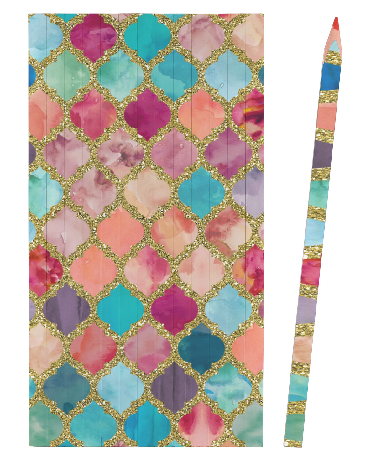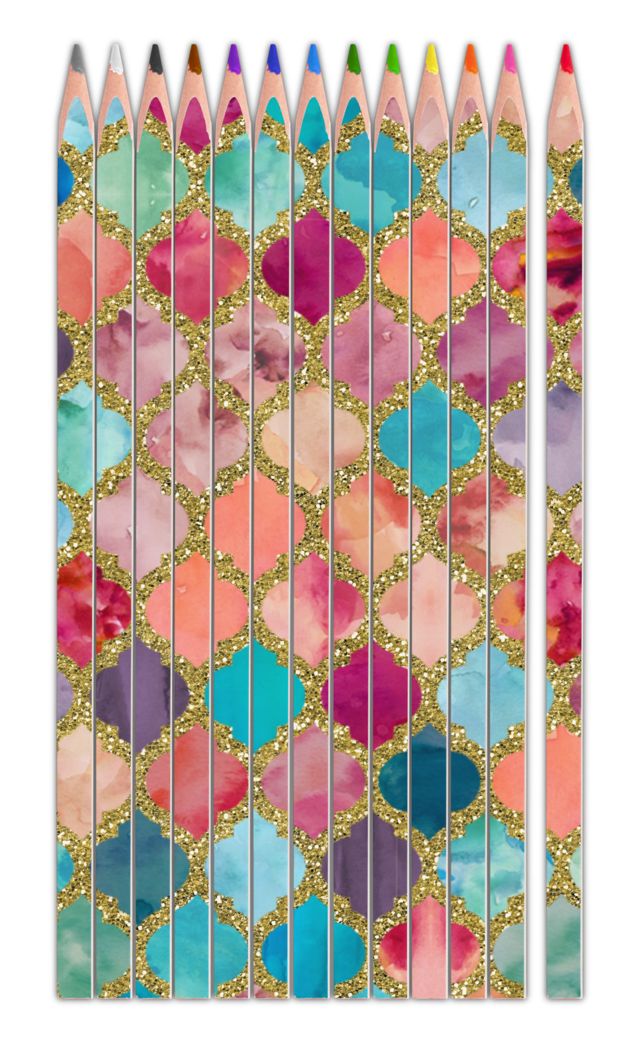 This design is simply the glitter moroccan pattern. The glitter outlining the pattern is a sparkling looking gold. The inside of the moroccan pattern is a watercolor texture with pinks, purples, teals, peaches, and blues. The coordinating design has a fun name and initial in the beautiful gold color.