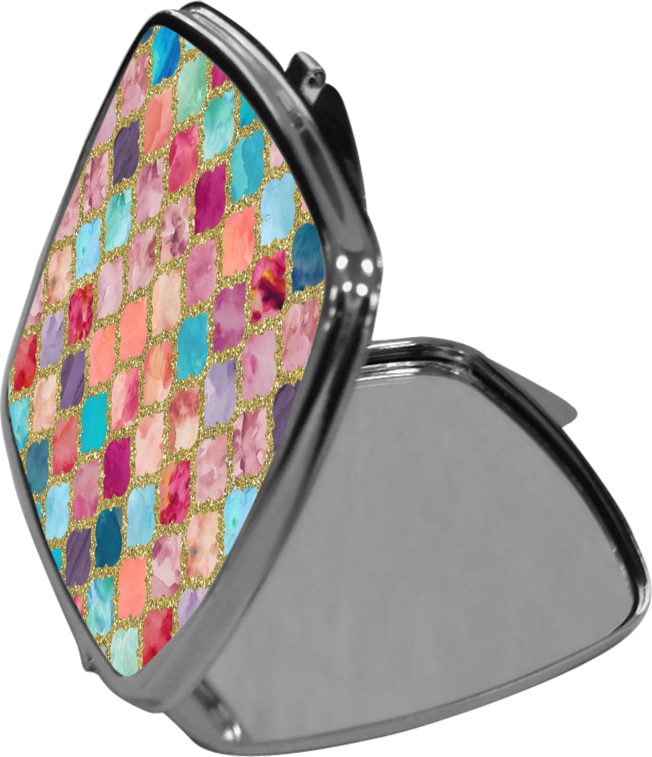 Our compact mirrors are customized with your design on one side. The other side is patterned silver tone metal. Inside, there are two mirrors.