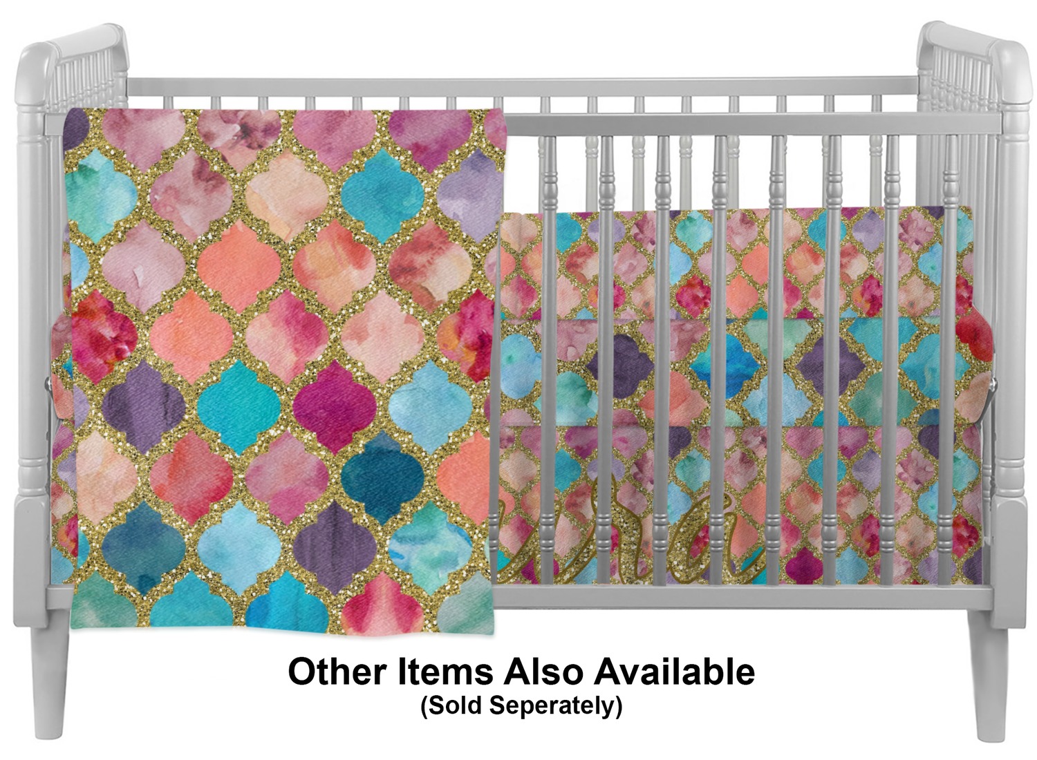 This design is simply the glitter moroccan pattern. The glitter outlining the pattern is a sparkling looking gold. The inside of the moroccan pattern is a watercolor texture with pinks, purples, teals, peaches, and blues. The coordinating design has a fun name and initial in the beautiful gold color.