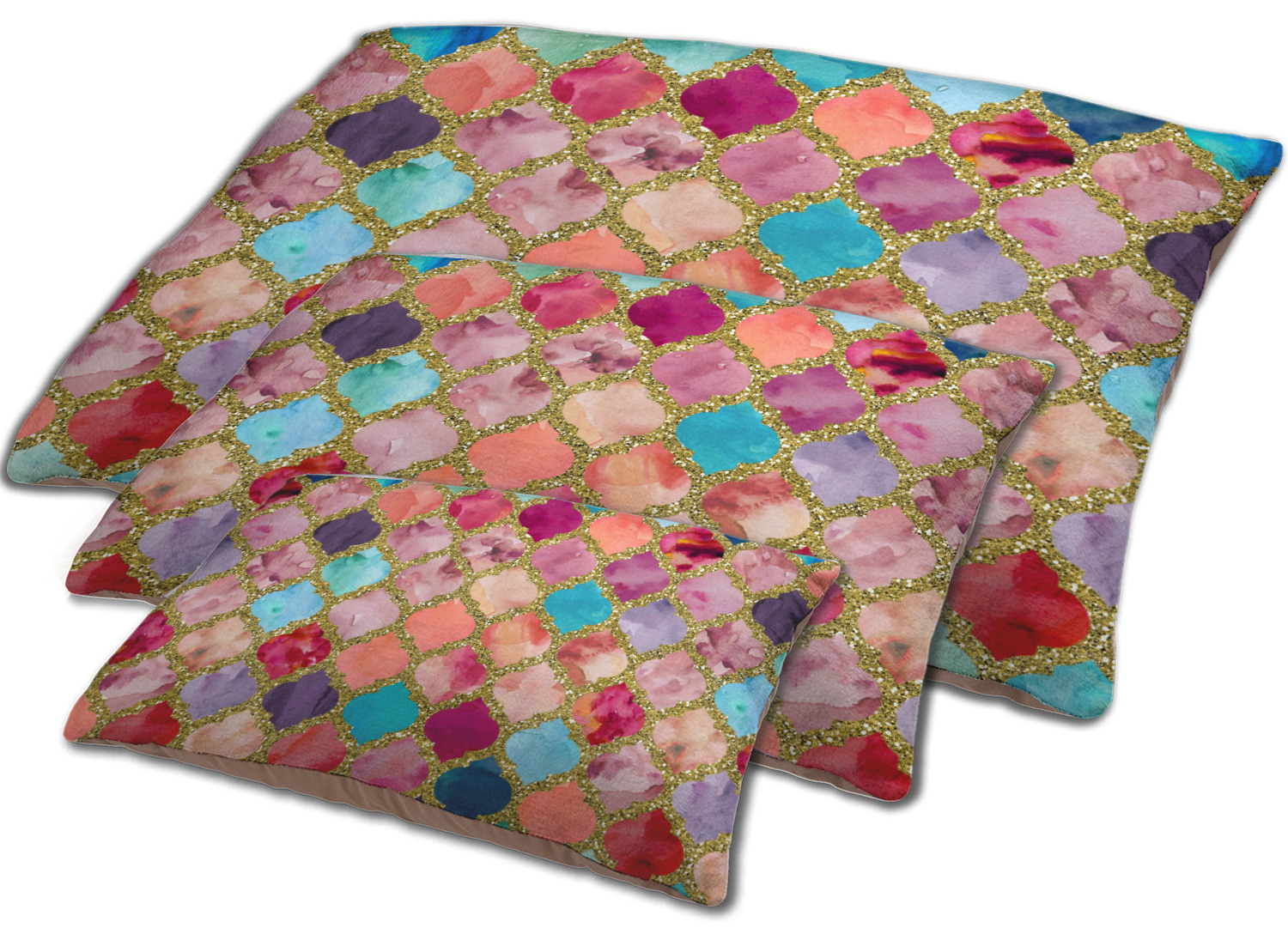 This design is simply the glitter moroccan pattern. The glitter outlining the pattern is a sparkling looking gold. The inside of the moroccan pattern is a watercolor texture with pinks, purples, teals, peaches, and blues. The coordinating design has a fun name and initial in the beautiful gold color.