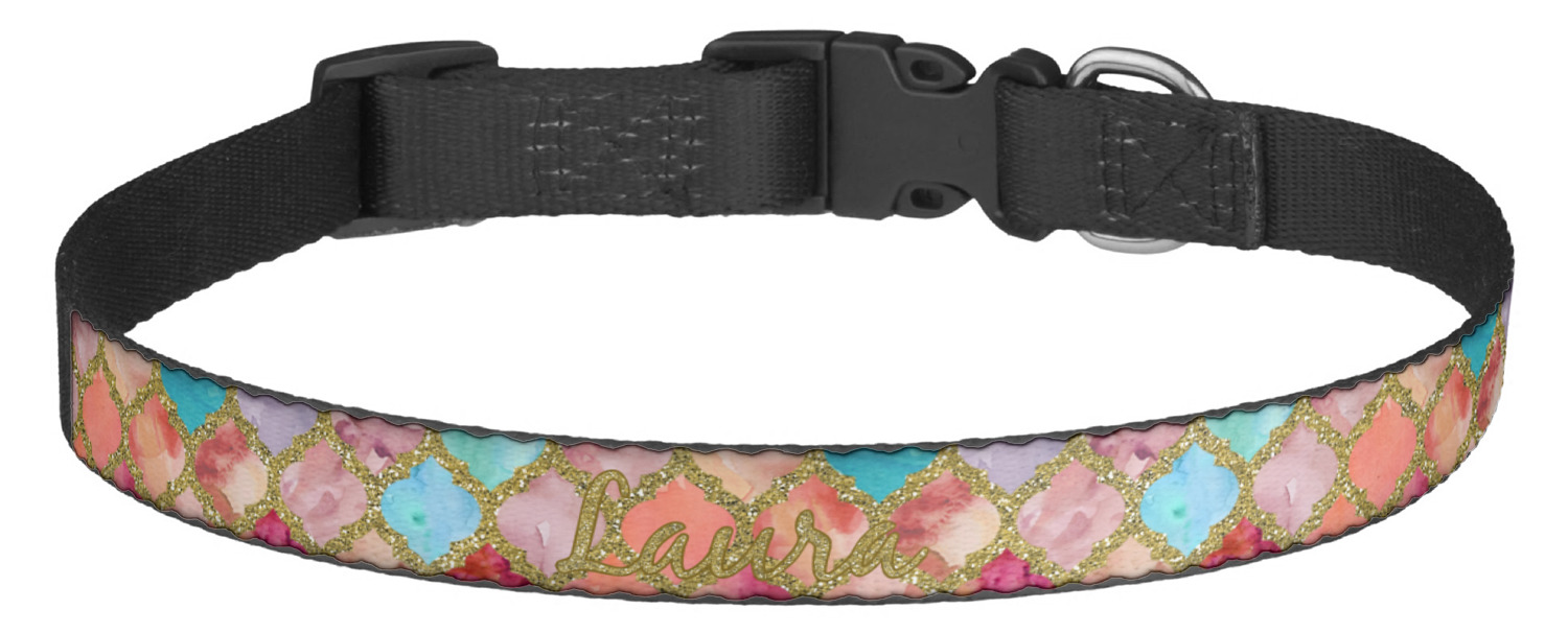 This sturdy collar, made from a durable nylon weave, will outlive your dog's episodes of excited tugging and pulling. Courtesy of its thick plastic buckle and adjuster, this collar is adjustable and accommodating of any dog. Structurally, the collar is a single piece of nylon weave that is sewn together, and features a solid metal loop where you can attach a leash or dog tag. We print and display your dog's name and pattern across the middle of the personalized dog collar.