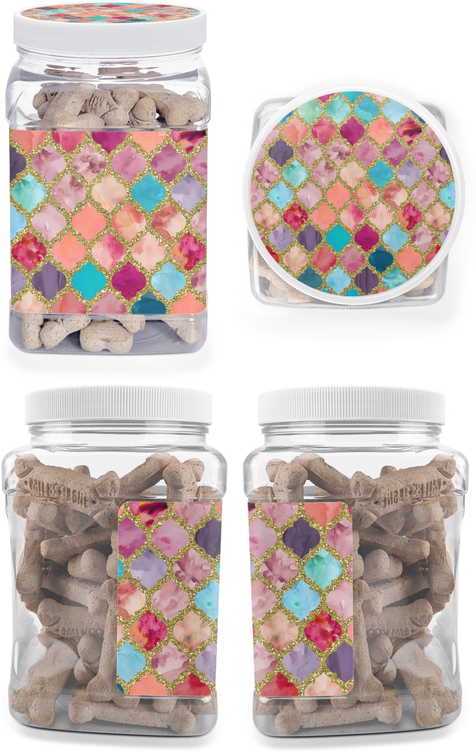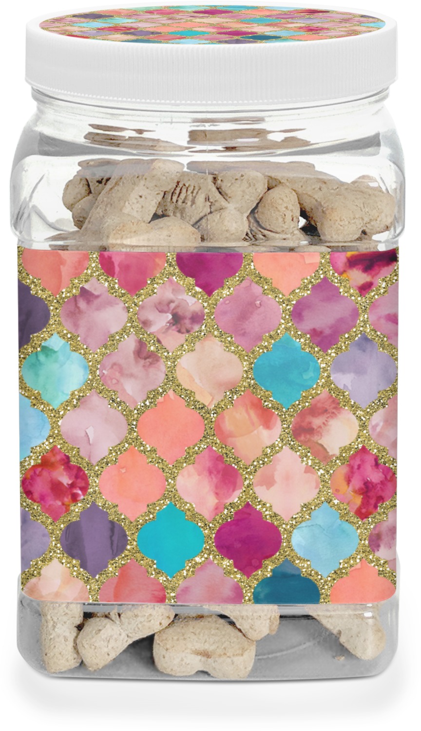 This half gallon jar, made from a sturdy plastic, is the perfect way to keep treats from any naughty pet paws, while still keeping them ready on hand for when your pup performs an impressive trick. This dog cookie jar features a screw-on, white lid that displays your personalized design on a vinyl sticker. We apply another customized sticker that wraps around the front and sides of the jar. Our dog treat jar also has indentations on the rear ends of the sides, which allows for convenient handling, and its square frame allows for easy storage.