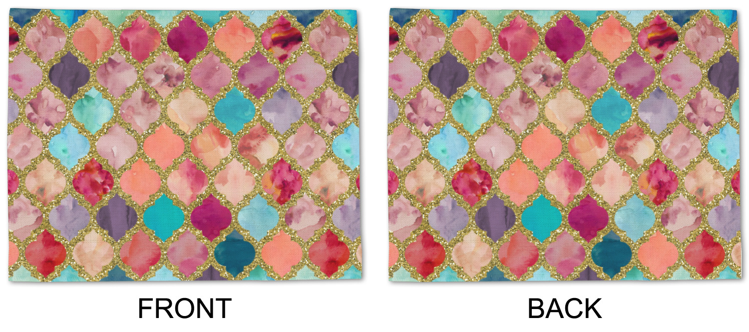This design is simply the glitter moroccan pattern. The glitter outlining the pattern is a sparkling looking gold. The inside of the moroccan pattern is a watercolor texture with pinks, purples, teals, peaches, and blues. The coordinating design has a fun name and initial in the beautiful gold color.
