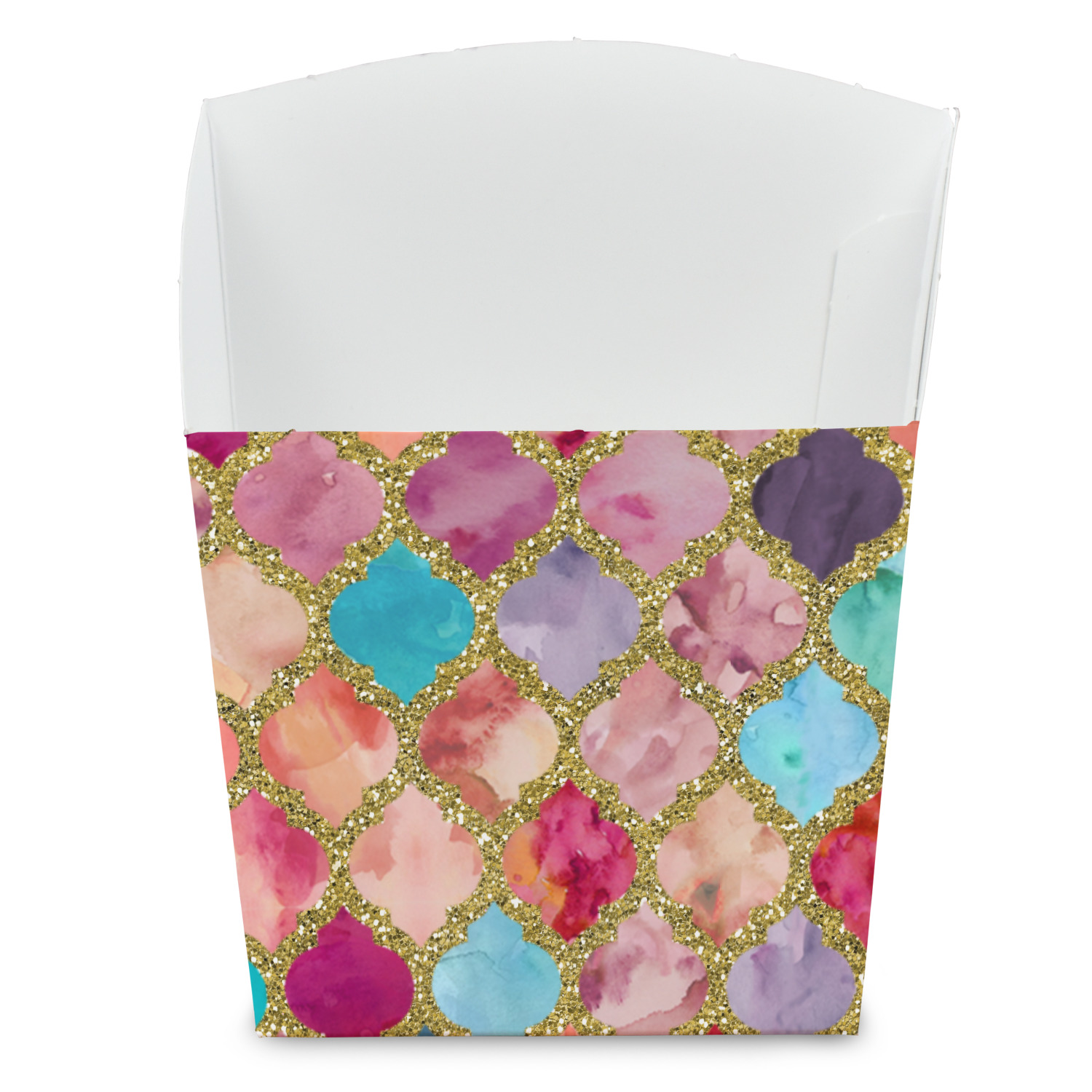 Since it is an open box, it works very well as a party snack cup (instead of plates) for different types of dry snacks and treats such as popcorn, cheezies, pretzels, chips, twizzlers, etc. This box can easily be carried with a drink all in one hand!