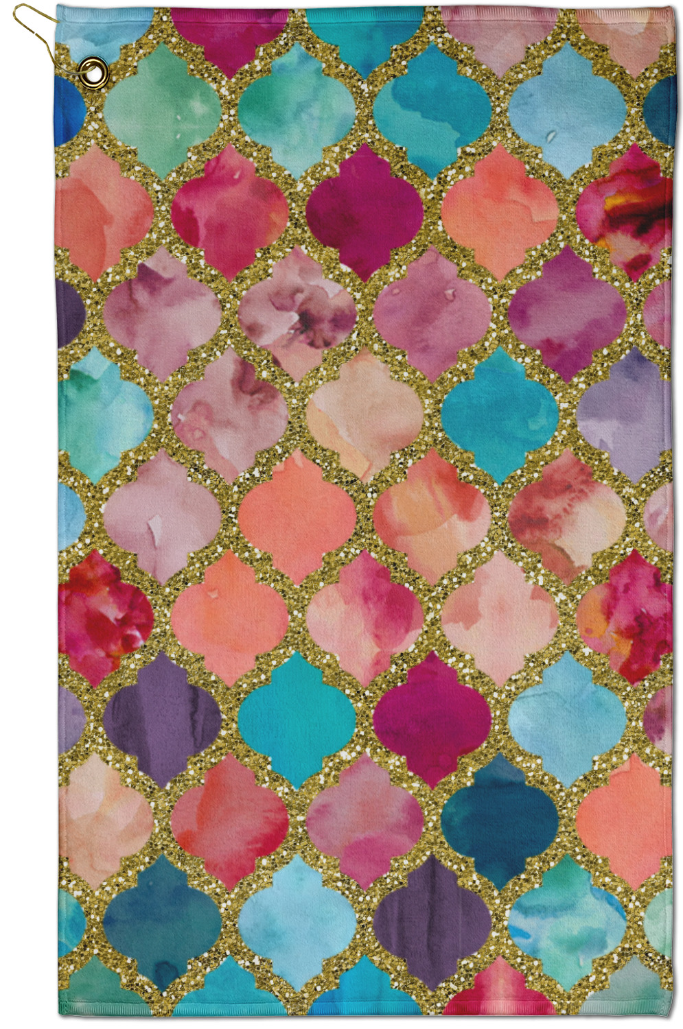 The towel is fully printed / patterned on the front polyester side; and is white on terrycloth cotton backside. The towel has grommet and a pear spring clip in the top left corner. Our golf towels are available in 100s of different prints and patterns.
