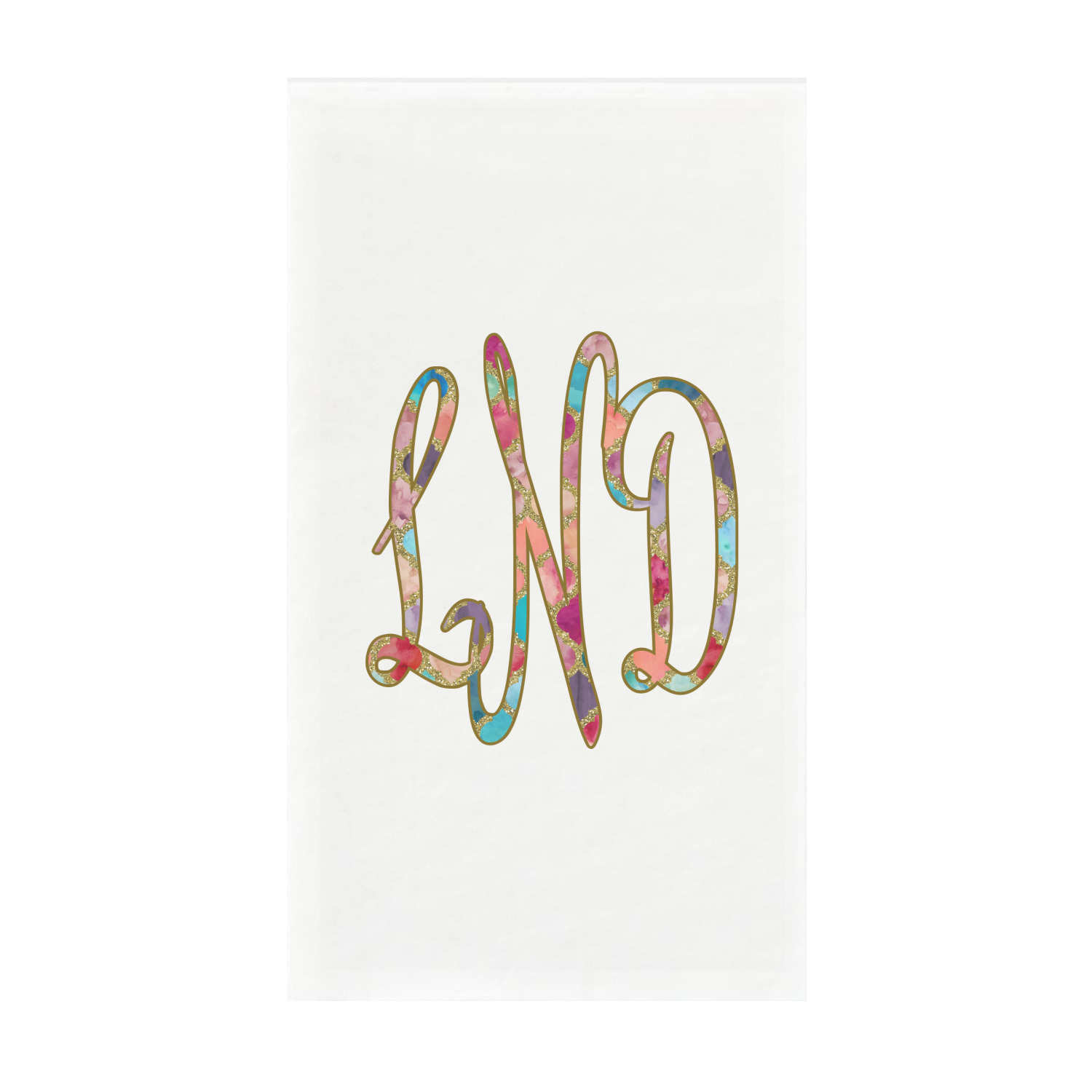 This design is simply the glitter moroccan pattern. The glitter outlining the pattern is a sparkling looking gold. The inside of the moroccan pattern is a watercolor texture with pinks, purples, teals, peaches, and blues. The coordinating design has a fun name and initial in the beautiful gold color.