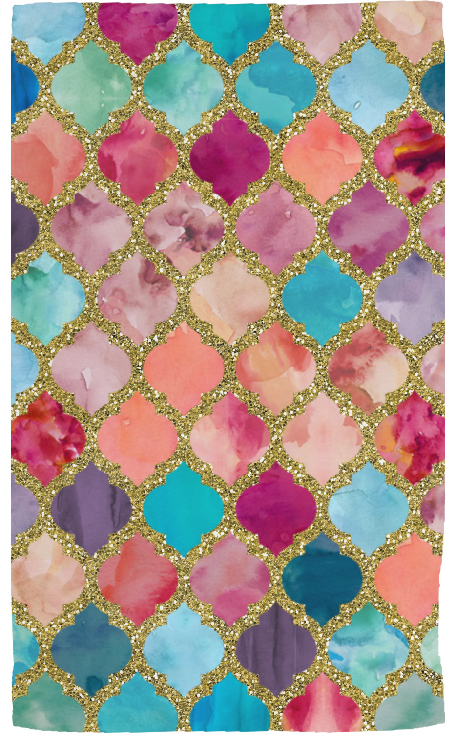 This design is simply the glitter moroccan pattern. The glitter outlining the pattern is a sparkling looking gold. The inside of the moroccan pattern is a watercolor texture with pinks, purples, teals, peaches, and blues. The coordinating design has a fun name and initial in the beautiful gold color.
