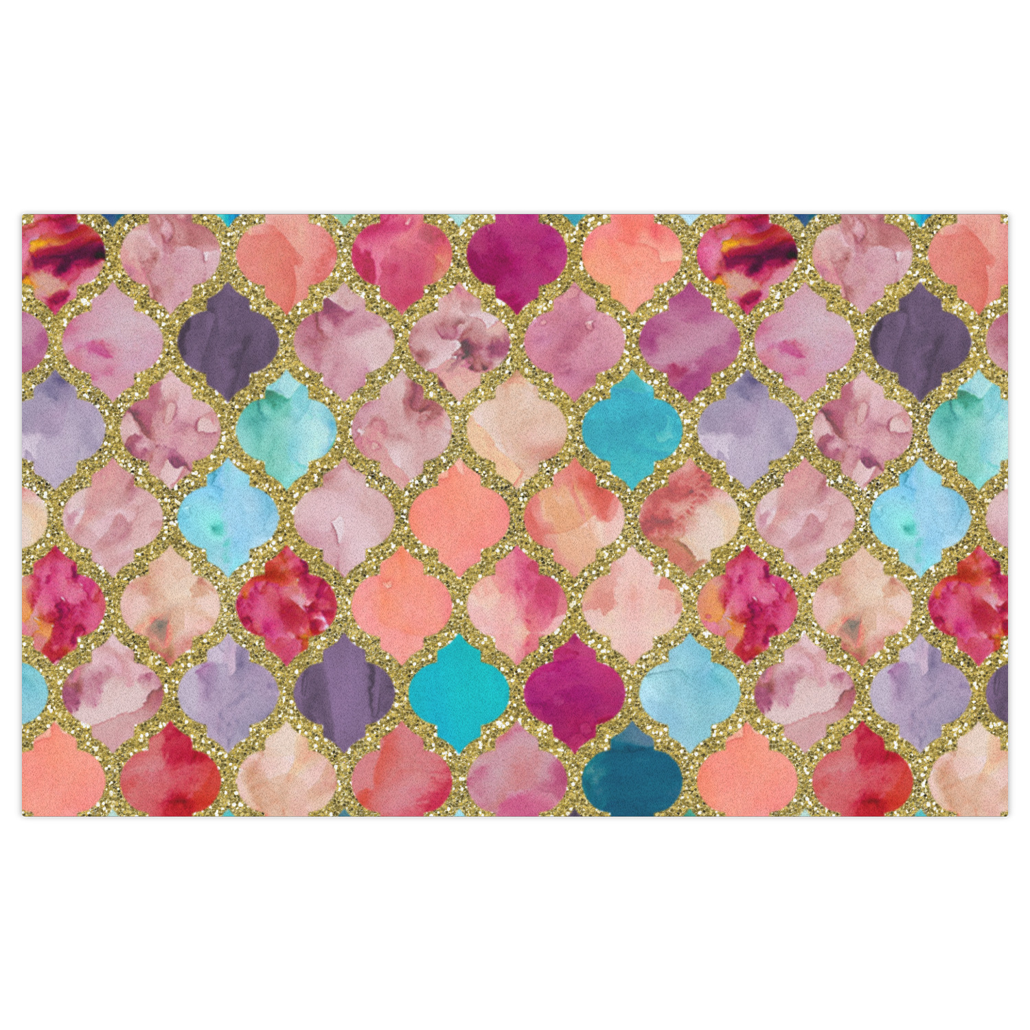 This design is simply the glitter moroccan pattern. The glitter outlining the pattern is a sparkling looking gold. The inside of the moroccan pattern is a watercolor texture with pinks, purples, teals, peaches, and blues. The coordinating design has a fun name and initial in the beautiful gold color.