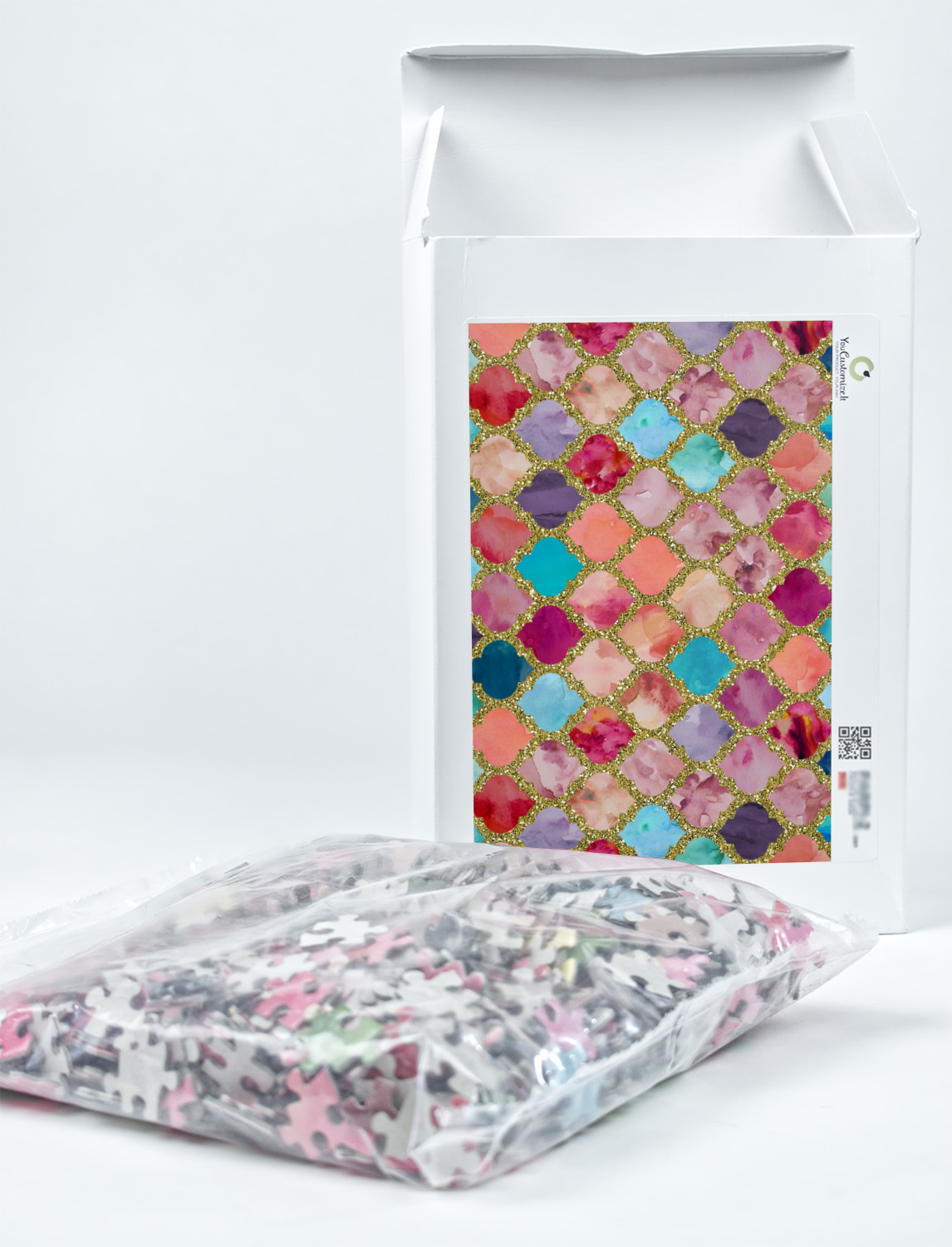 You can also upload your logo or art that you or your kids drew. To create more challenging jigsaw puzzles, you can create a pattern from with your logo or artwork. You can also add other elements such as text or personalization.