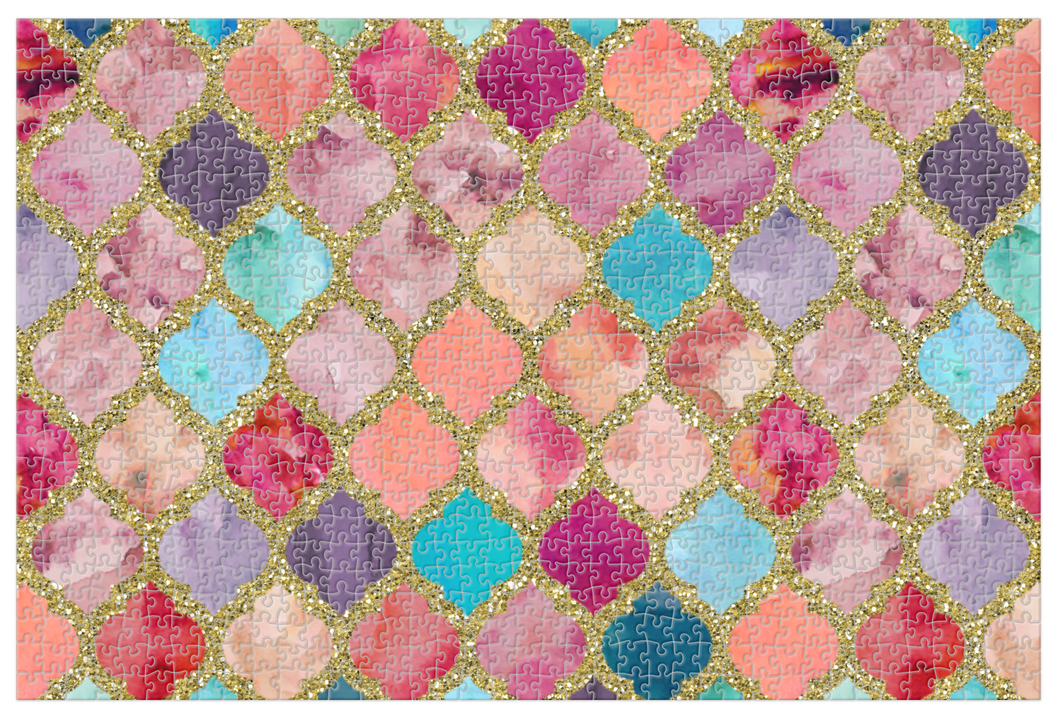 This design is simply the glitter moroccan pattern. The glitter outlining the pattern is a sparkling looking gold. The inside of the moroccan pattern is a watercolor texture with pinks, purples, teals, peaches, and blues. The coordinating design has a fun name and initial in the beautiful gold color.
