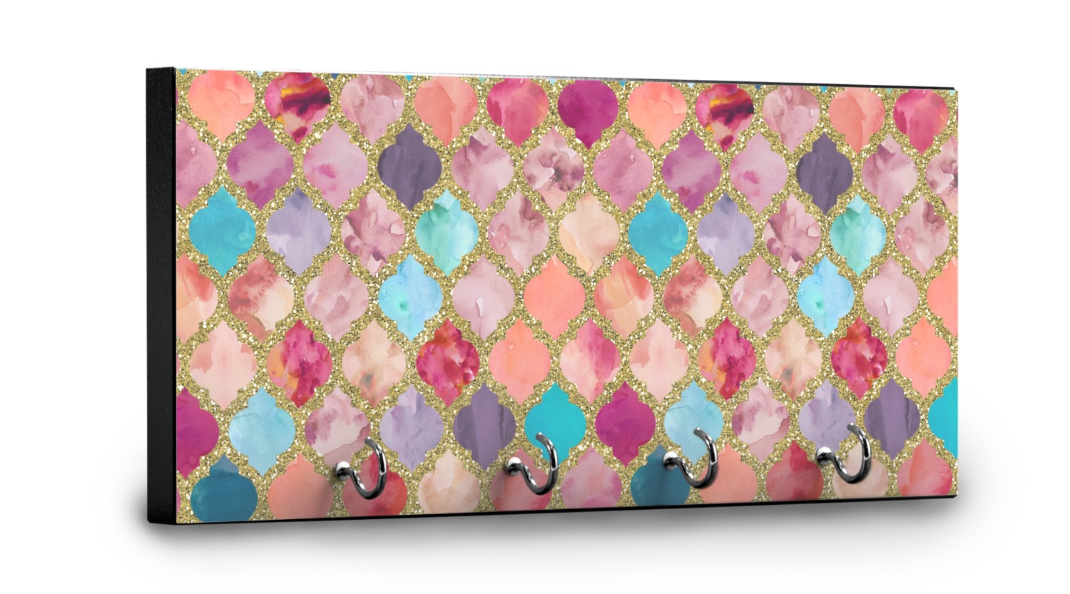 This design is simply the glitter moroccan pattern. The glitter outlining the pattern is a sparkling looking gold. The inside of the moroccan pattern is a watercolor texture with pinks, purples, teals, peaches, and blues. The coordinating design has a fun name and initial in the beautiful gold color.