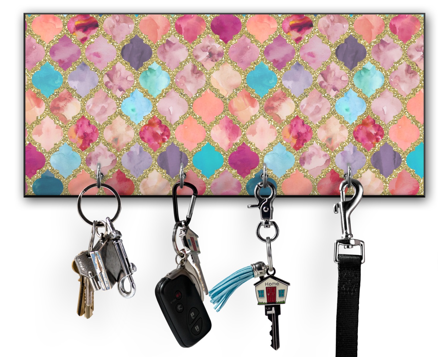 This 11" x 5" key hanger is made of sturdy wood and has four metal hooks lining the bottom. This is the perfect size for a family with several drivers. Not only can you hang keys on it though, but pet leashes and other small items. The board is black on the sides and back and is printed with the design of your choice on the front.