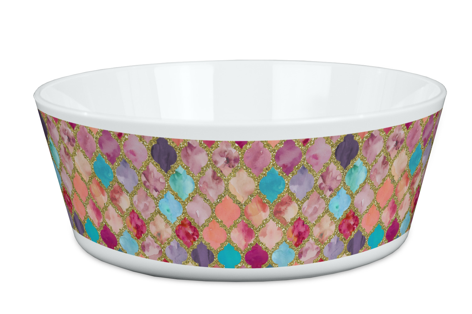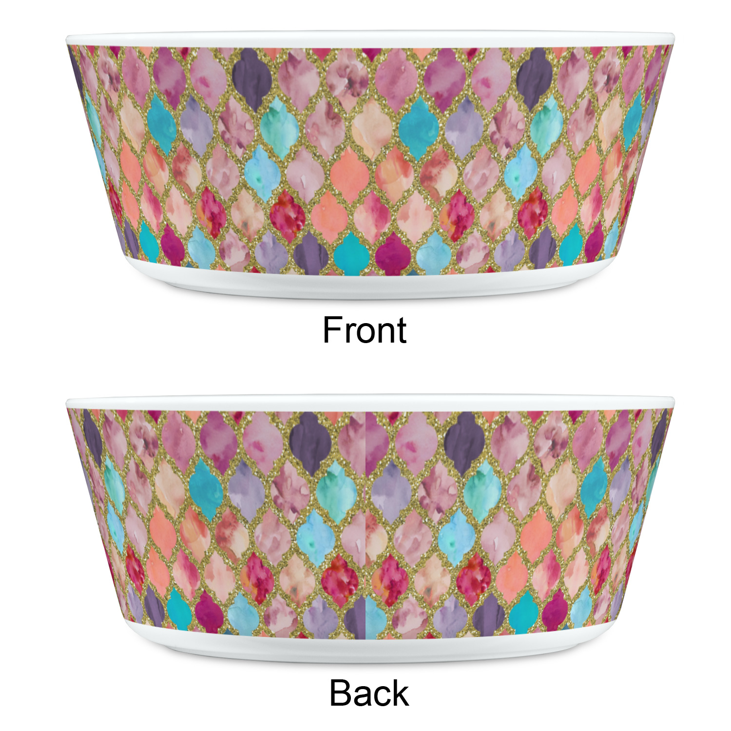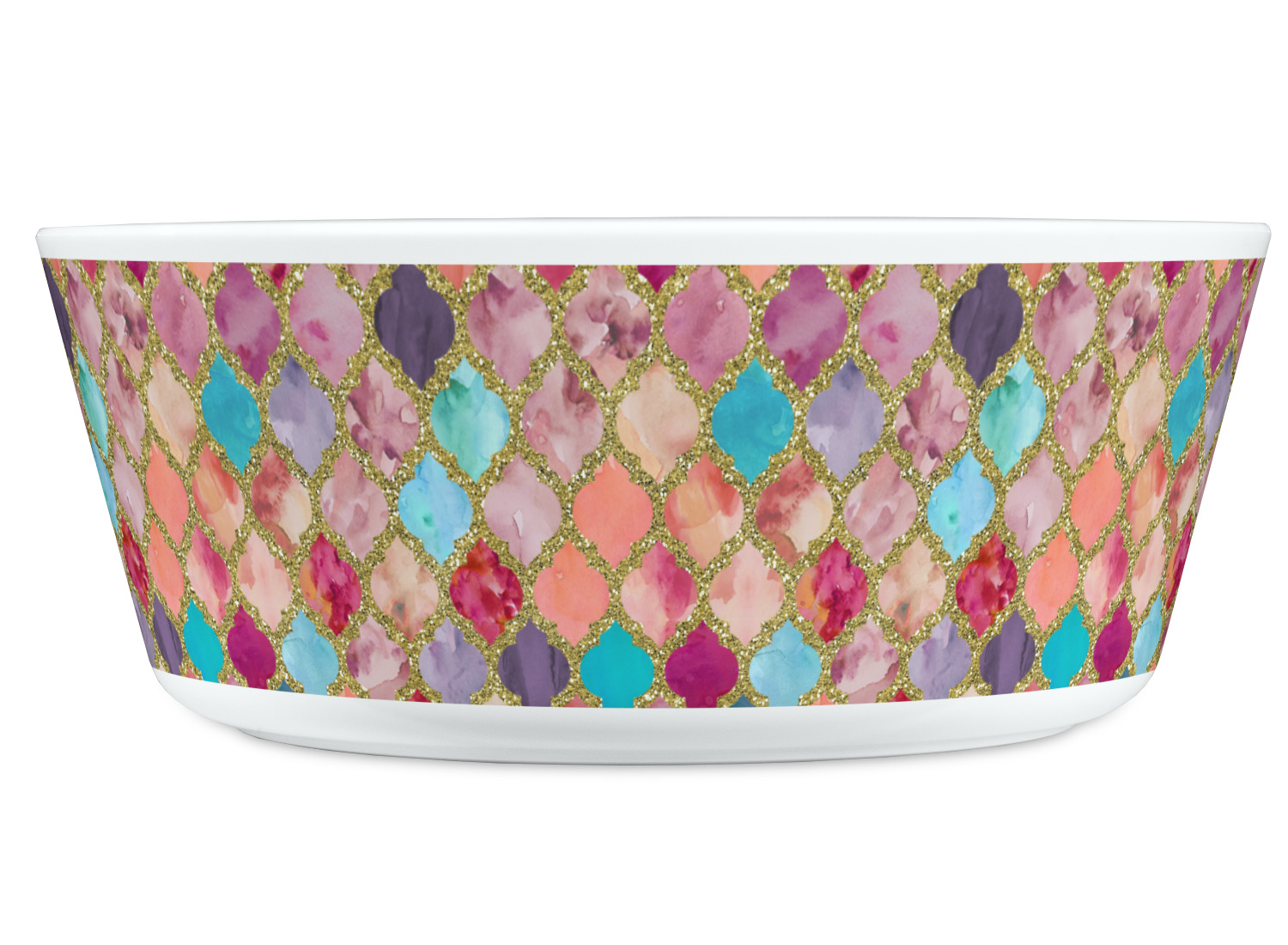 This design is simply the glitter moroccan pattern. The glitter outlining the pattern is a sparkling looking gold. The inside of the moroccan pattern is a watercolor texture with pinks, purples, teals, peaches, and blues. The coordinating design has a fun name and initial in the beautiful gold color.