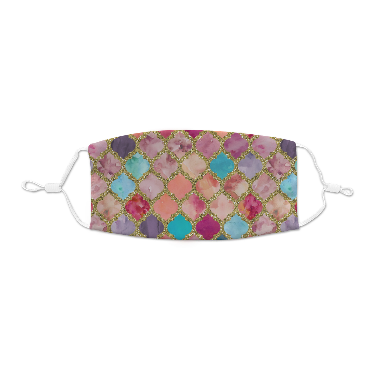 This design is simply the glitter moroccan pattern. The glitter outlining the pattern is a sparkling looking gold. The inside of the moroccan pattern is a watercolor texture with pinks, purples, teals, peaches, and blues. The coordinating design has a fun name and initial in the beautiful gold color.