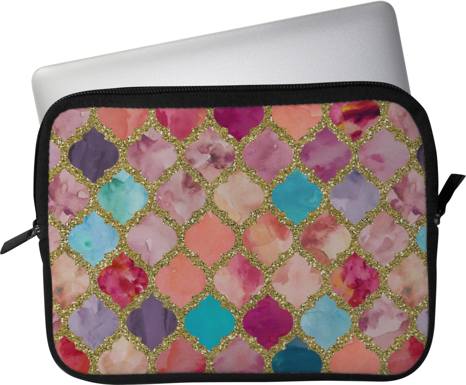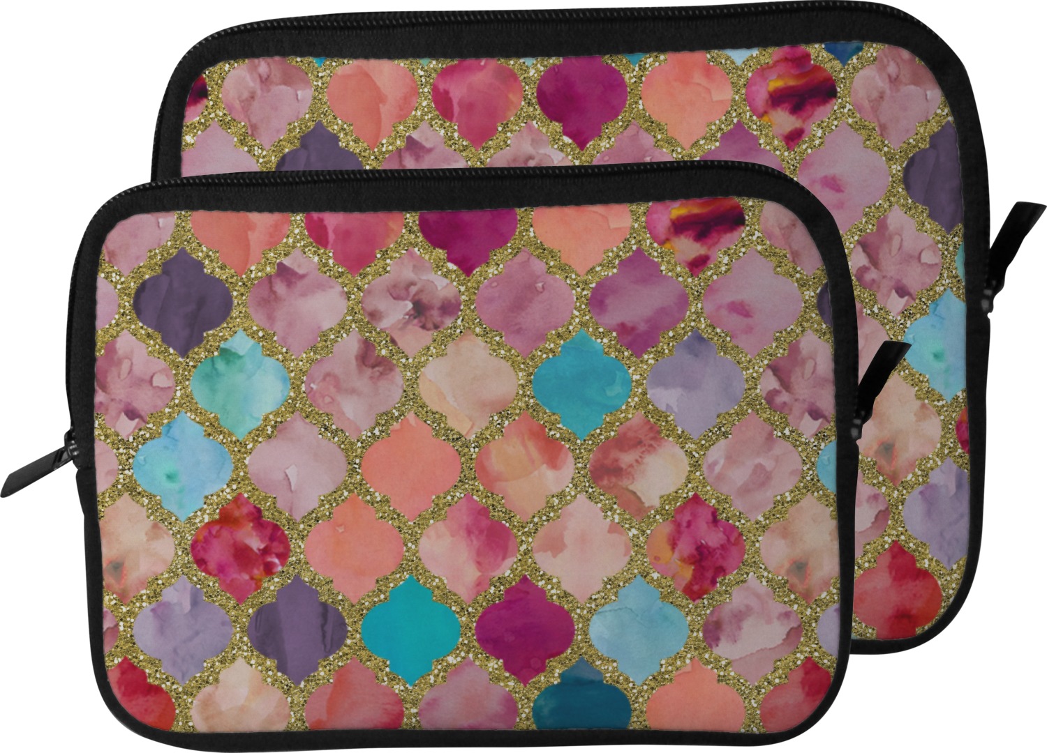 This design is simply the glitter moroccan pattern. The glitter outlining the pattern is a sparkling looking gold. The inside of the moroccan pattern is a watercolor texture with pinks, purples, teals, peaches, and blues. The coordinating design has a fun name and initial in the beautiful gold color.