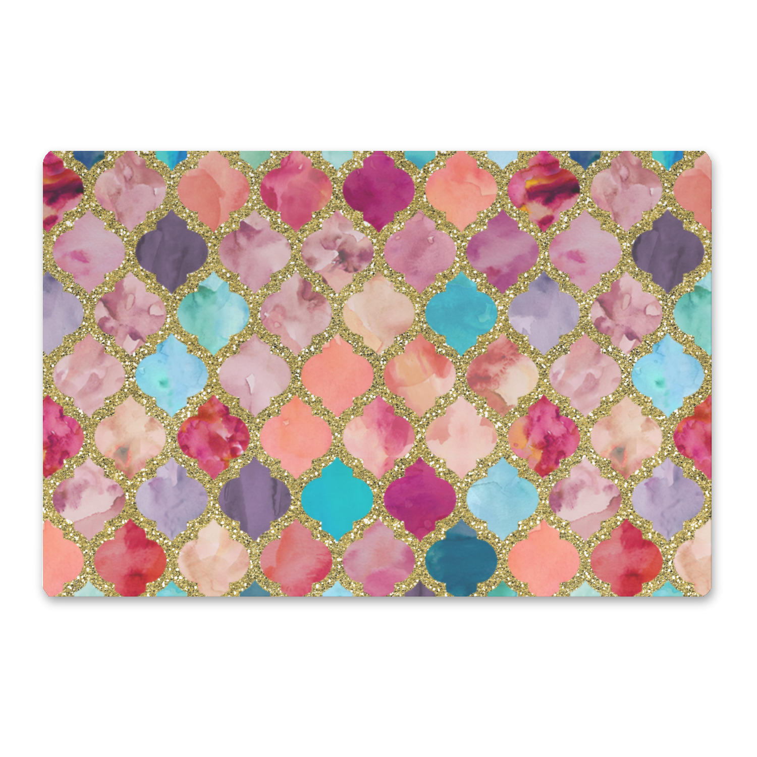 This design is simply the glitter moroccan pattern. The glitter outlining the pattern is a sparkling looking gold. The inside of the moroccan pattern is a watercolor texture with pinks, purples, teals, peaches, and blues. The coordinating design has a fun name and initial in the beautiful gold color.