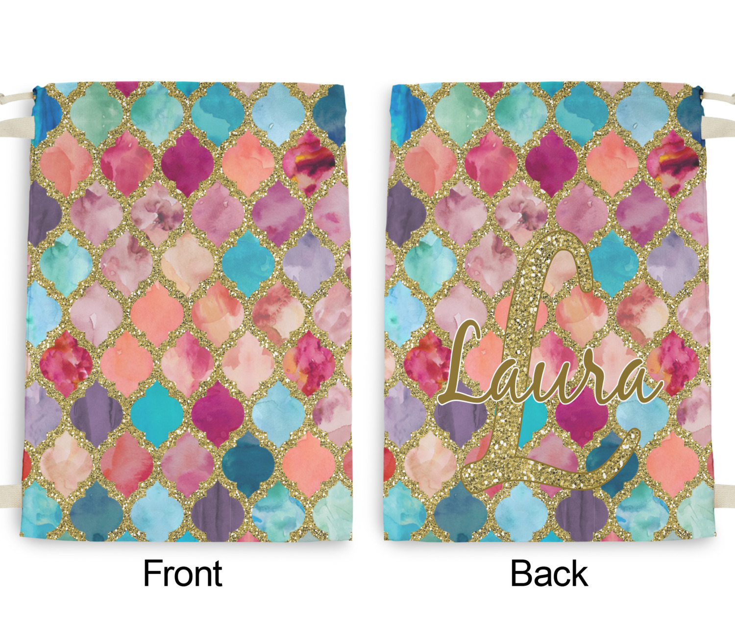 This design is simply the glitter moroccan pattern. The glitter outlining the pattern is a sparkling looking gold. The inside of the moroccan pattern is a watercolor texture with pinks, purples, teals, peaches, and blues. The coordinating design has a fun name and initial in the beautiful gold color.