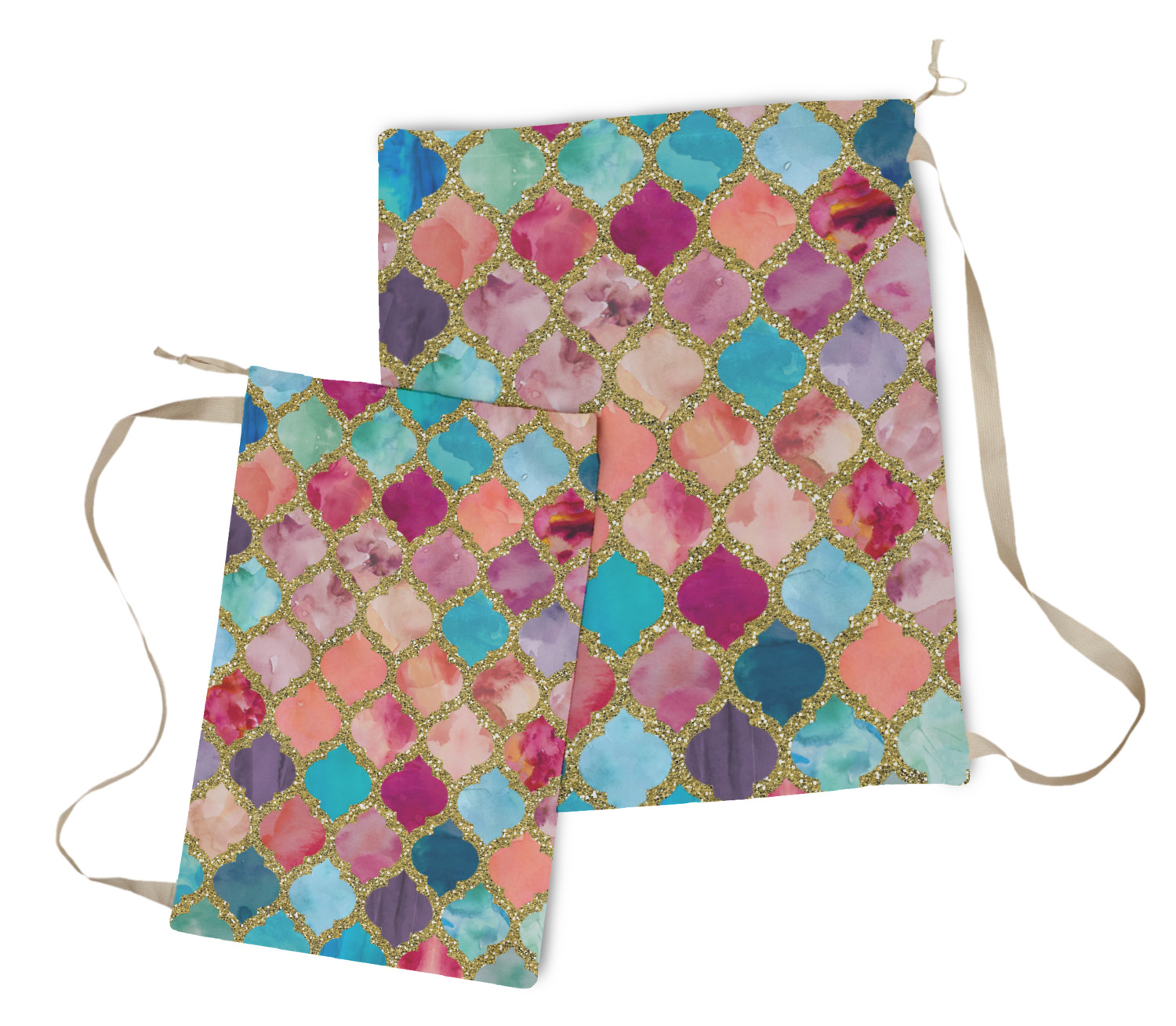 This design is simply the glitter moroccan pattern. The glitter outlining the pattern is a sparkling looking gold. The inside of the moroccan pattern is a watercolor texture with pinks, purples, teals, peaches, and blues. The coordinating design has a fun name and initial in the beautiful gold color.