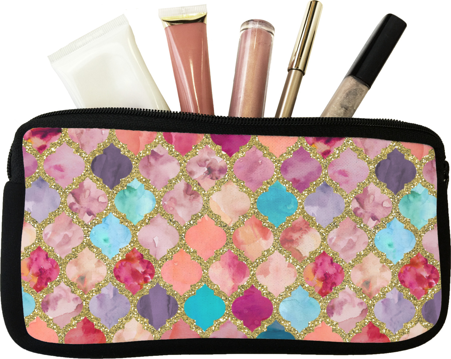 Our personalized makeup bags are available in many different designs, patterns and colors - so you are sure to find one that will love. They are made of neoprene (same material as wet-suits) and thus are water resistant, so spillages in your makeup bag will not end up all over you purse. They are customized on one side and are black on the other side and the zipper is black as well.