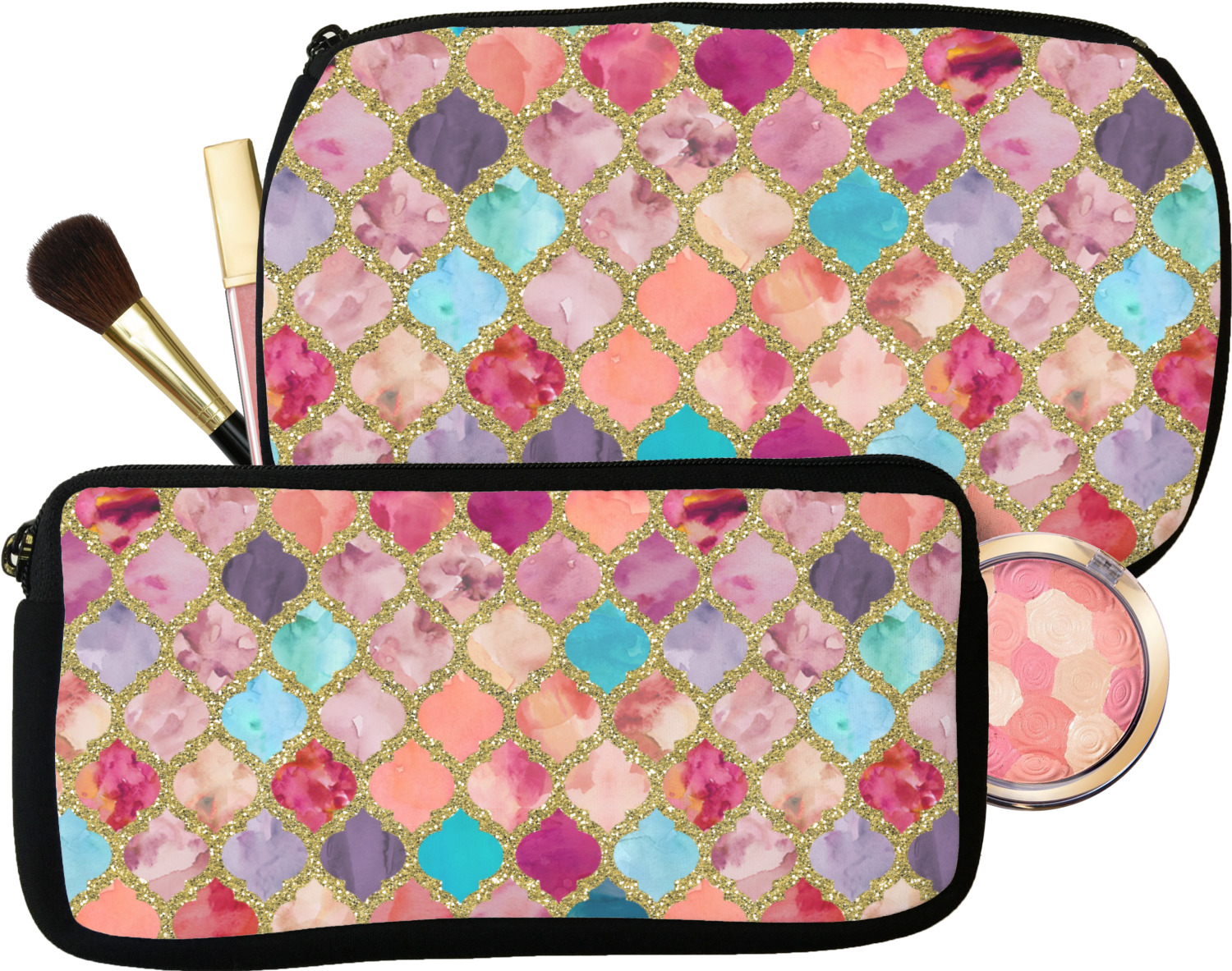 Our personalized makeup bags are available in many different designs, patterns and colors - so you are sure to find one that will love. They are made of neoprene (same material as wet-suits) and thus are water resistant, so spillages in your makeup bag will not end up all over you purse. They are customized on one side and are black on the other side and the zipper is black as well.