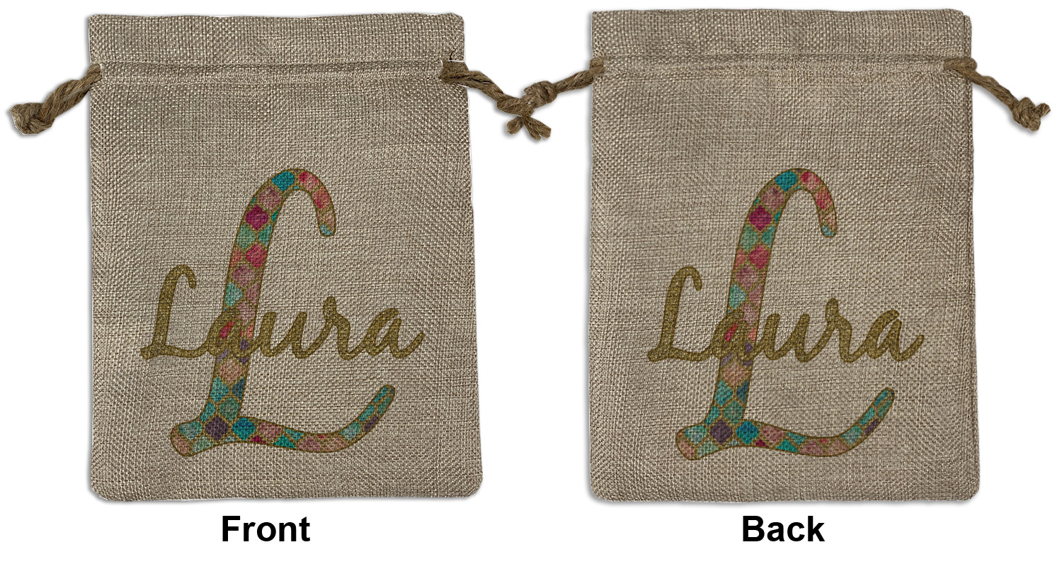 We sell our Burlap Gift Bags in 3 variant sized bags. Made with burlap polyester, each personalized bag can be secured with a twine drawstring pull. Your custom design is available to print on one side or both sides - completely up to you! The sizes of the bags measure approximately 4.5" x 6.5" for the smallest size, 6.5" x 8.0" for the medium size, and 6.5" x 13.5" for the large-sized bag.