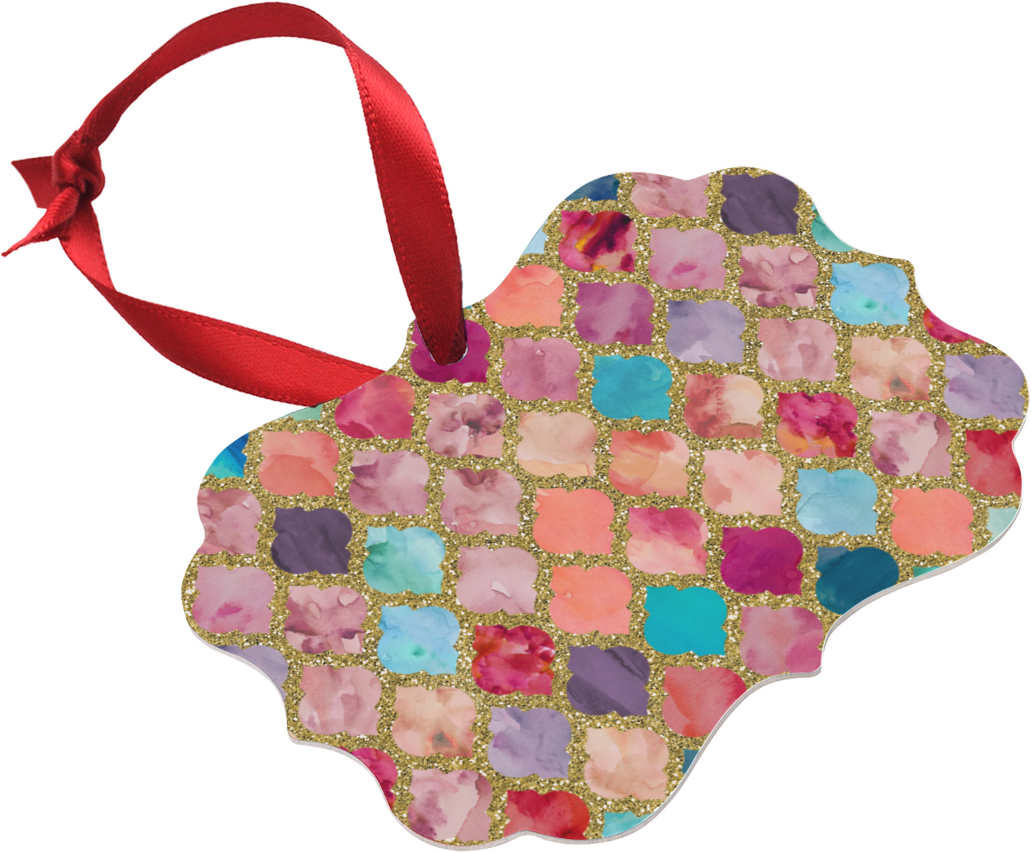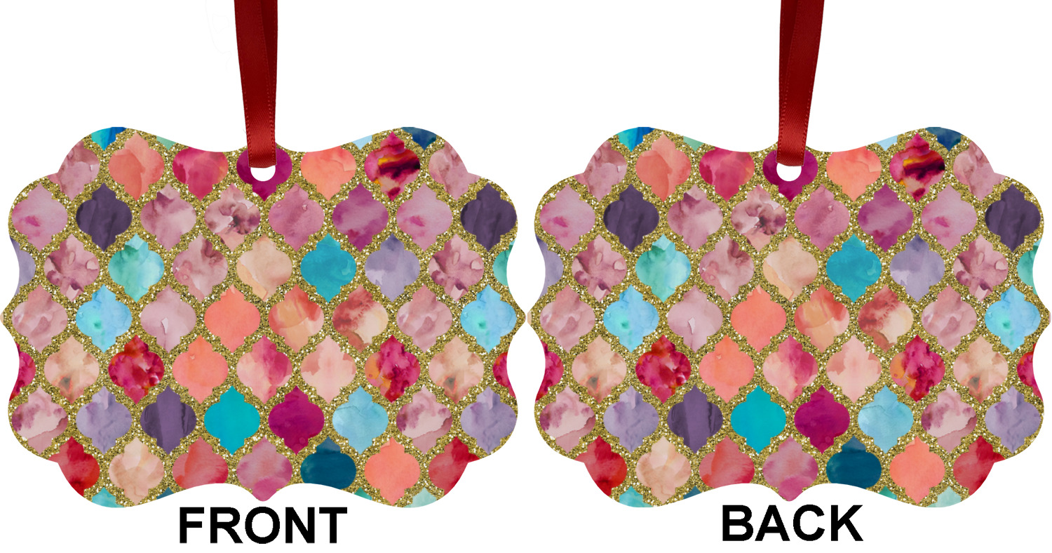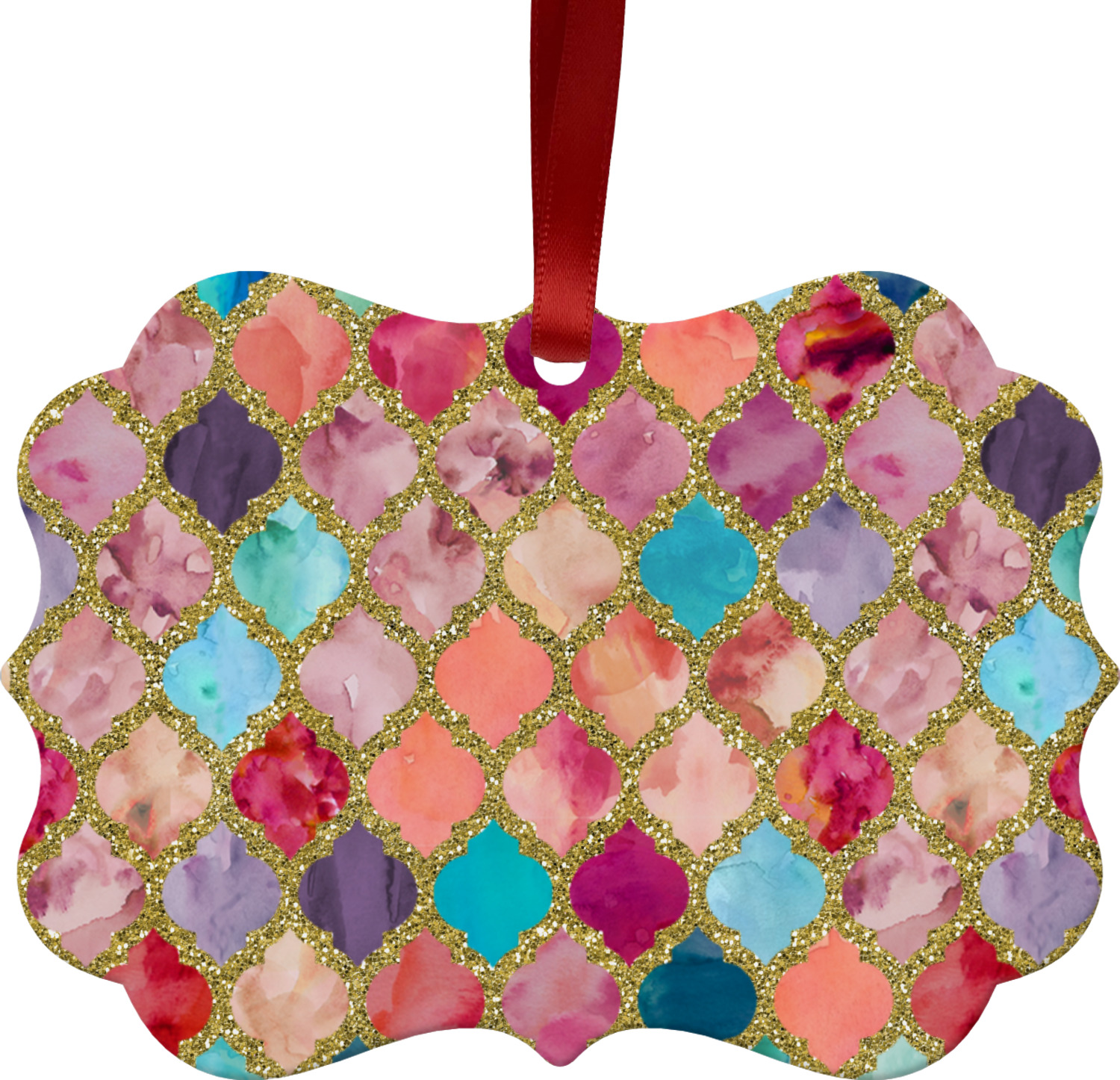 This design is simply the glitter moroccan pattern. The glitter outlining the pattern is a sparkling looking gold. The inside of the moroccan pattern is a watercolor texture with pinks, purples, teals, peaches, and blues. The coordinating design has a fun name and initial in the beautiful gold color.