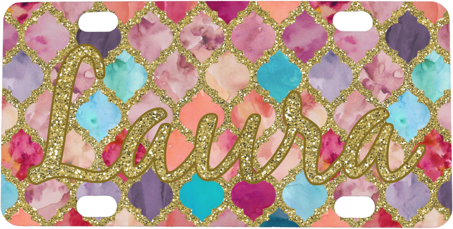 This design is simply the glitter moroccan pattern. The glitter outlining the pattern is a sparkling looking gold. The inside of the moroccan pattern is a watercolor texture with pinks, purples, teals, peaches, and blues. The coordinating design has a fun name and initial in the beautiful gold color.