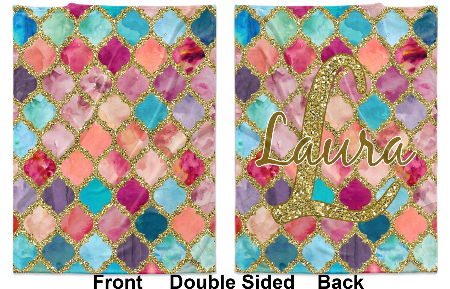 This design is simply the glitter moroccan pattern. The glitter outlining the pattern is a sparkling looking gold. The inside of the moroccan pattern is a watercolor texture with pinks, purples, teals, peaches, and blues. The coordinating design has a fun name and initial in the beautiful gold color.