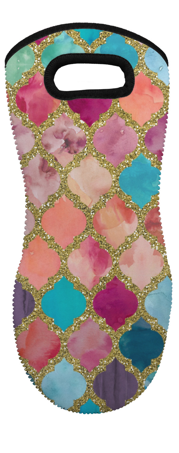 This design is simply the glitter moroccan pattern. The glitter outlining the pattern is a sparkling looking gold. The inside of the moroccan pattern is a watercolor texture with pinks, purples, teals, peaches, and blues. The coordinating design has a fun name and initial in the beautiful gold color.