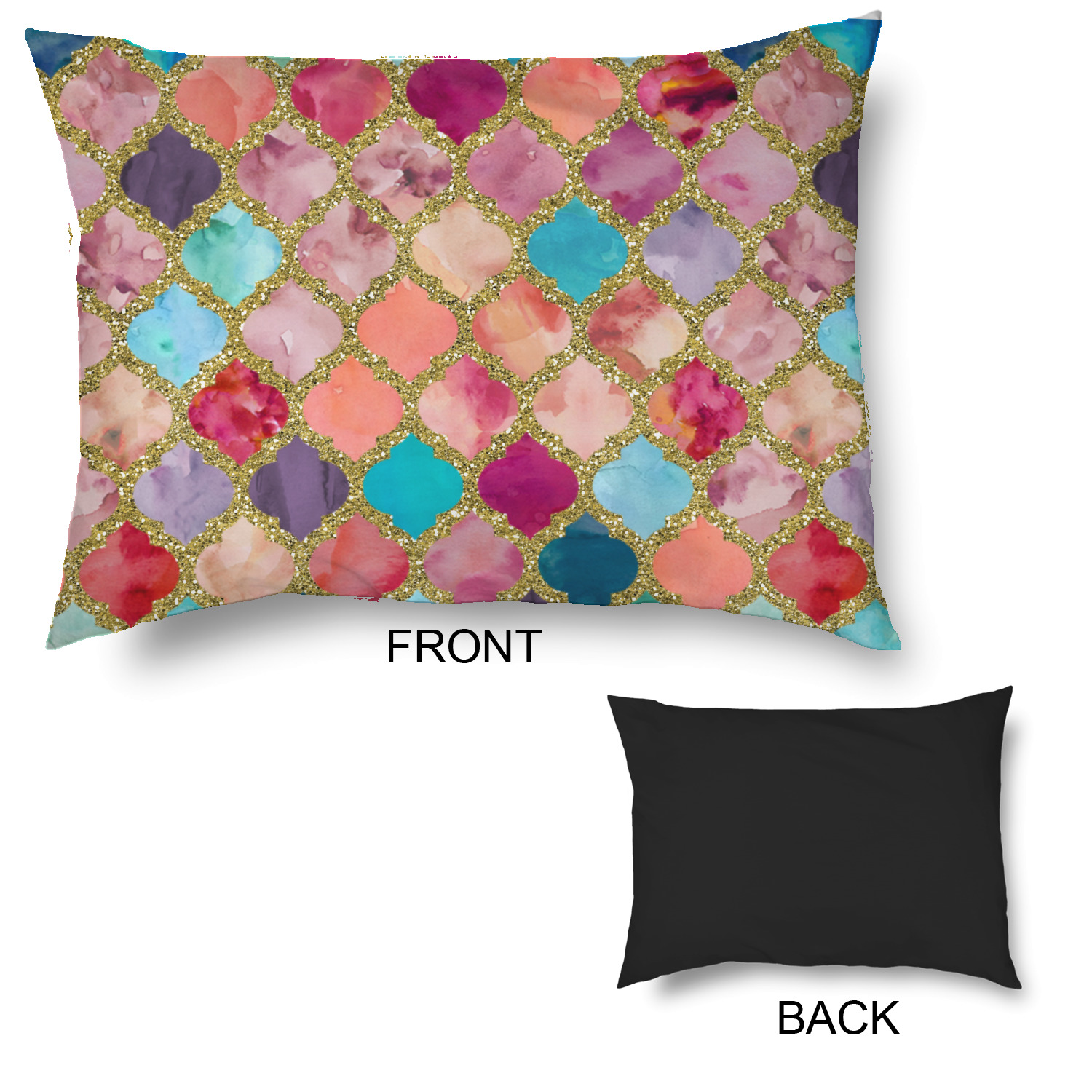 This design is simply the glitter moroccan pattern. The glitter outlining the pattern is a sparkling looking gold. The inside of the moroccan pattern is a watercolor texture with pinks, purples, teals, peaches, and blues. The coordinating design has a fun name and initial in the beautiful gold color.