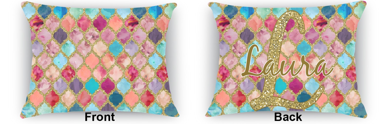 This design is simply the glitter moroccan pattern. The glitter outlining the pattern is a sparkling looking gold. The inside of the moroccan pattern is a watercolor texture with pinks, purples, teals, peaches, and blues. The coordinating design has a fun name and initial in the beautiful gold color.