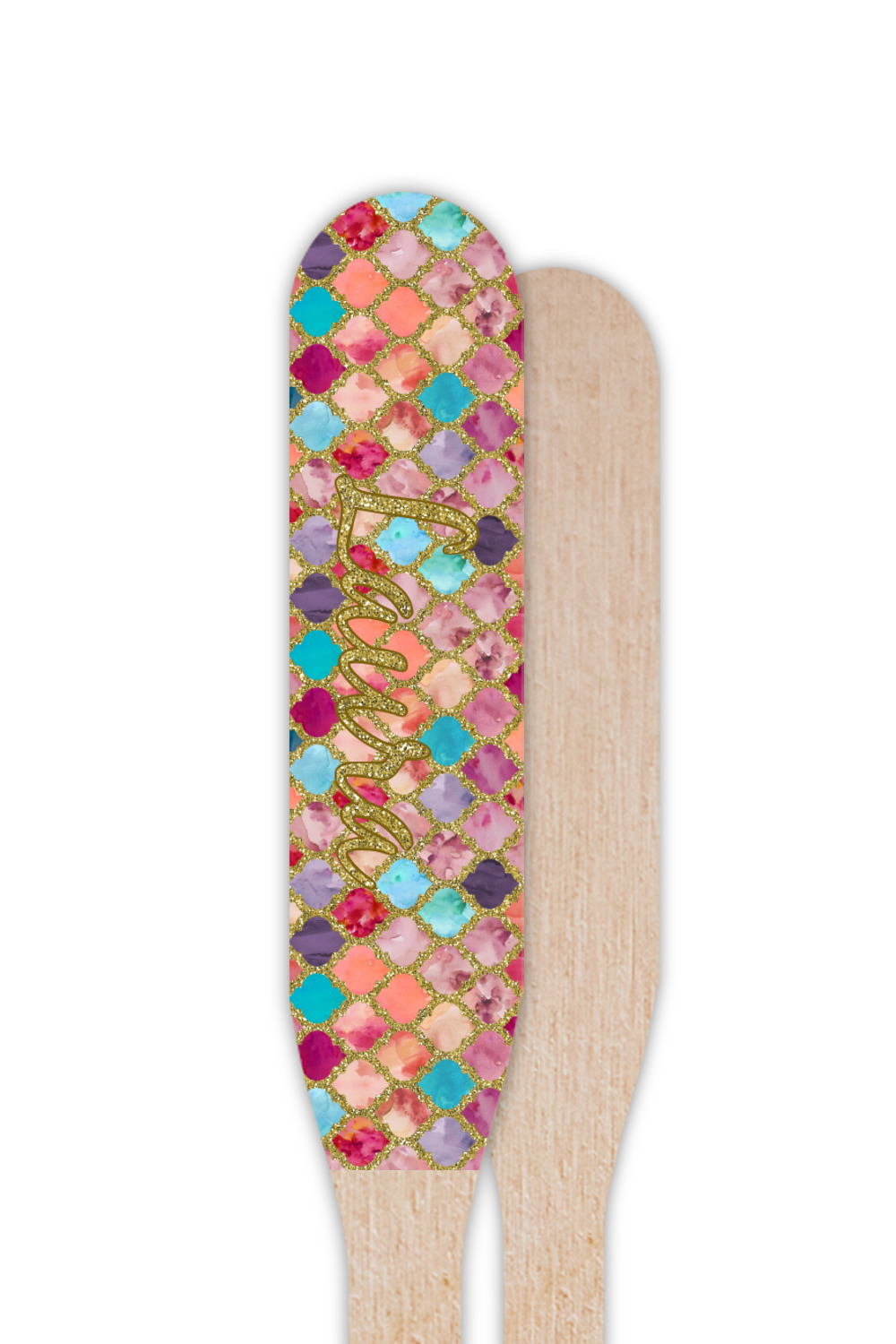 This design is simply the glitter moroccan pattern. The glitter outlining the pattern is a sparkling looking gold. The inside of the moroccan pattern is a watercolor texture with pinks, purples, teals, peaches, and blues. The coordinating design has a fun name and initial in the beautiful gold color.