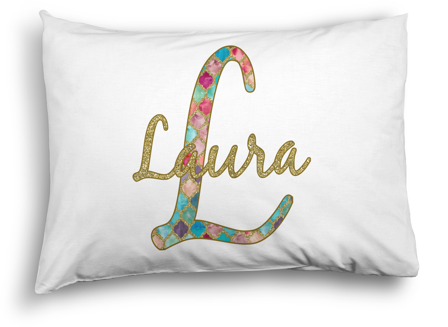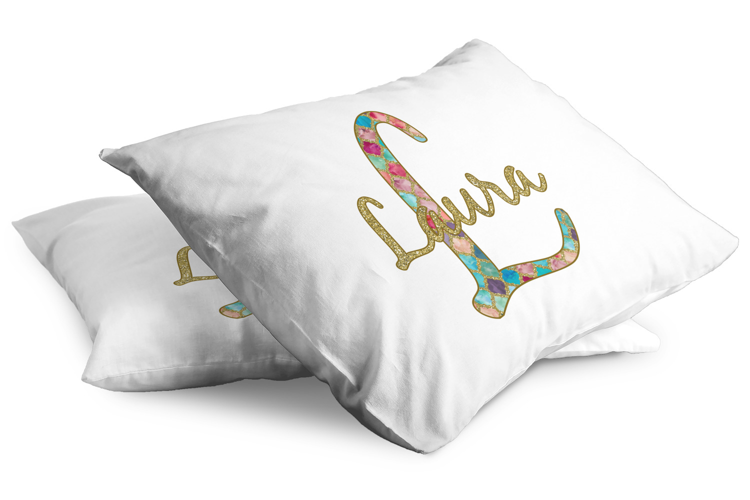 This design is simply the glitter moroccan pattern. The glitter outlining the pattern is a sparkling looking gold. The inside of the moroccan pattern is a watercolor texture with pinks, purples, teals, peaches, and blues. The coordinating design has a fun name and initial in the beautiful gold color.