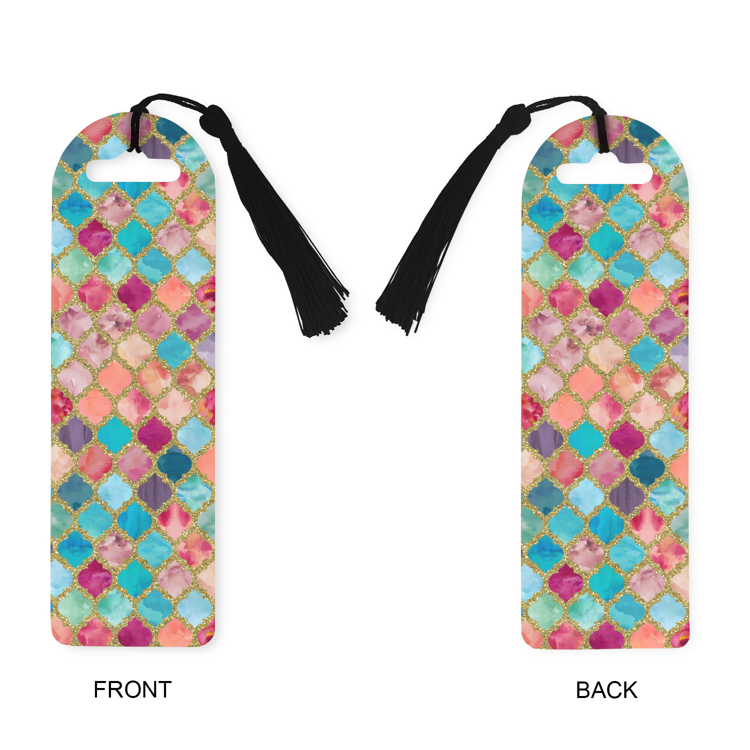 Made from a durable, flexible plastic, these bookmarks are printed with your custom design on them. With the tassel on them they make it easy to find your page in your book. These are a rectangular shape 7 1/4 inches tall with a rounded top and are approximately 2 1/4 inches wide.