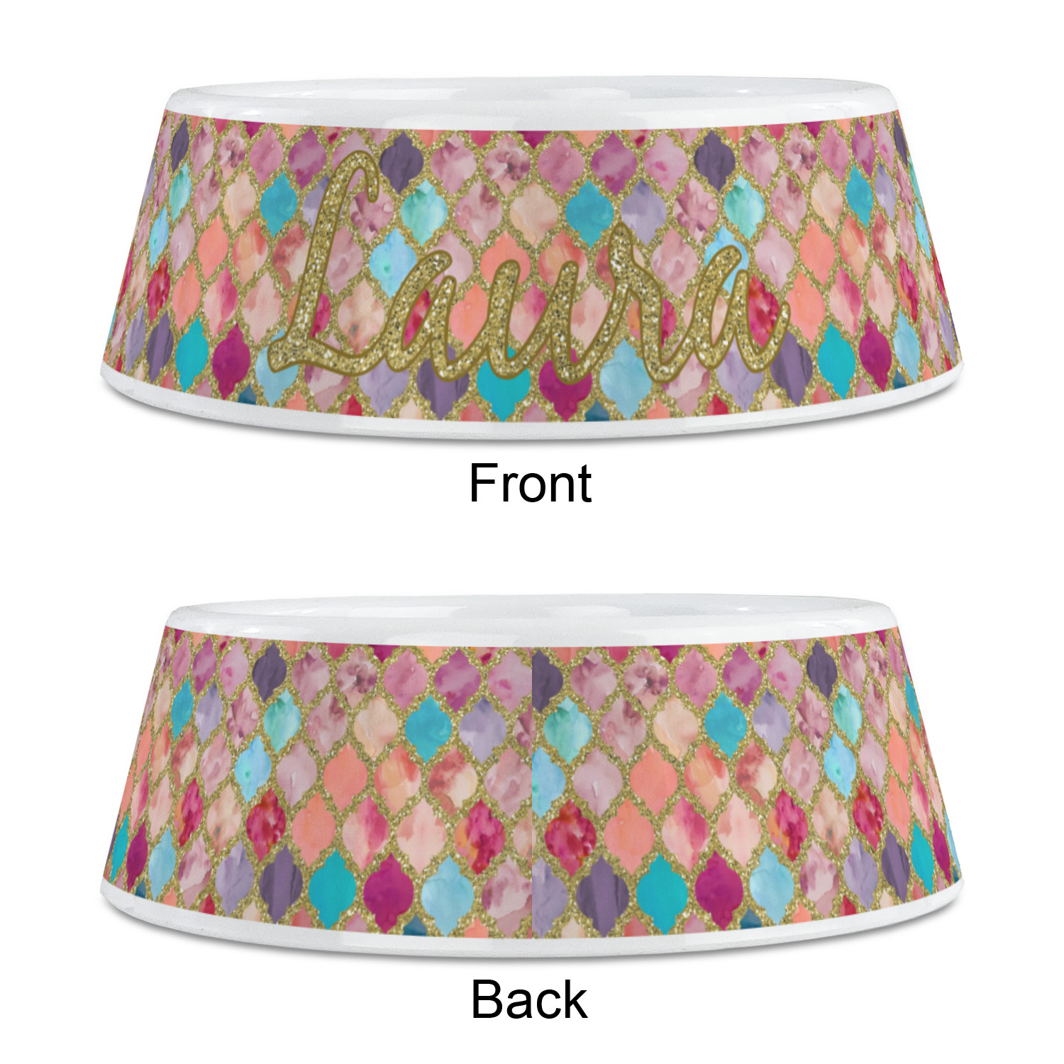 This design is simply the glitter moroccan pattern. The glitter outlining the pattern is a sparkling looking gold. The inside of the moroccan pattern is a watercolor texture with pinks, purples, teals, peaches, and blues. The coordinating design has a fun name and initial in the beautiful gold color.