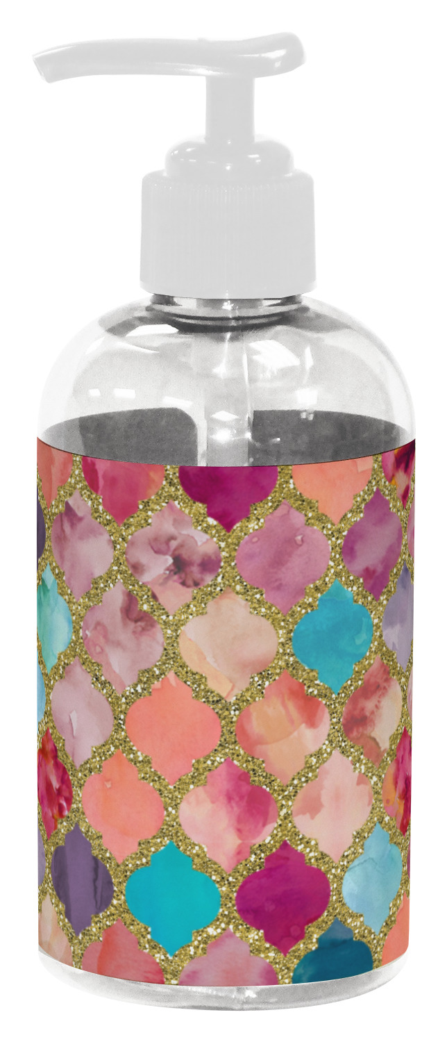 This design is simply the glitter moroccan pattern. The glitter outlining the pattern is a sparkling looking gold. The inside of the moroccan pattern is a watercolor texture with pinks, purples, teals, peaches, and blues. The coordinating design has a fun name and initial in the beautiful gold color.