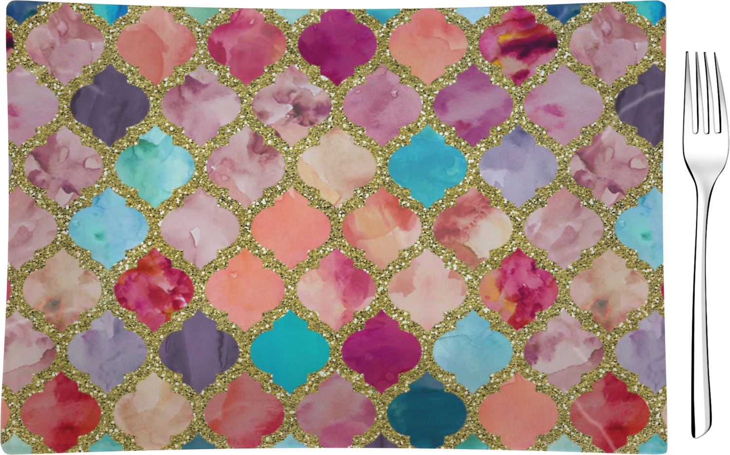 This design is simply the glitter moroccan pattern. The glitter outlining the pattern is a sparkling looking gold. The inside of the moroccan pattern is a watercolor texture with pinks, purples, teals, peaches, and blues. The coordinating design has a fun name and initial in the beautiful gold color.